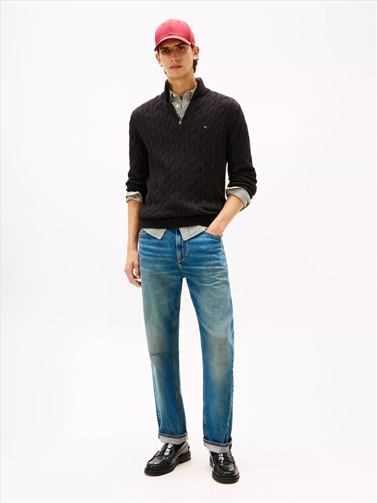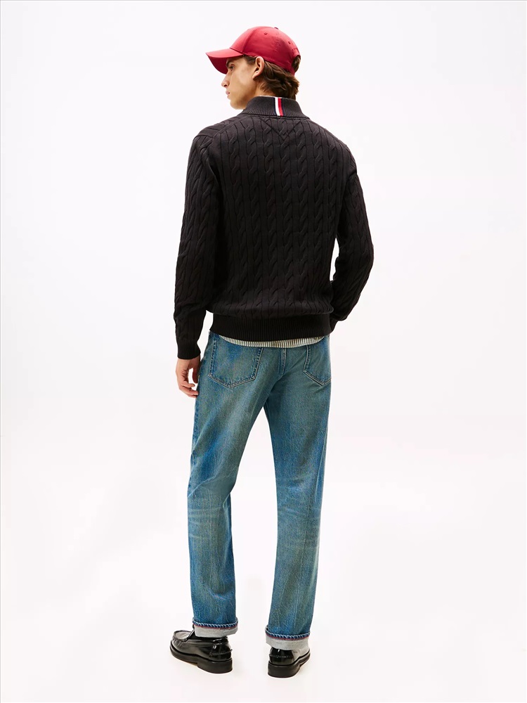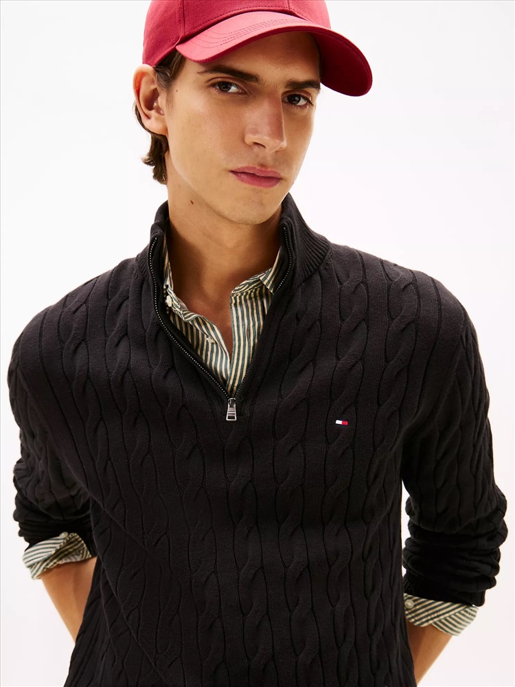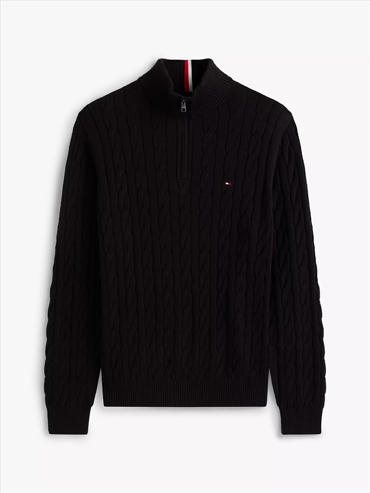Tommy Hilfiger men's sweater. Made from combed cotton, our durable cable knit mockneck quarter-zip sweater stays soft and breathable wash after wash.