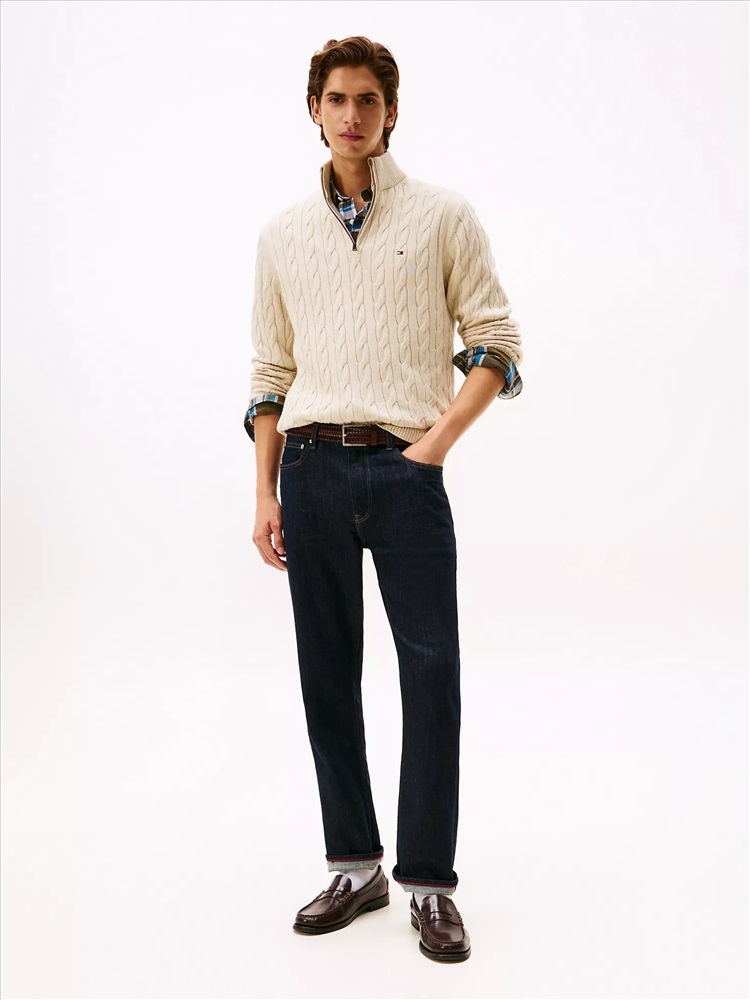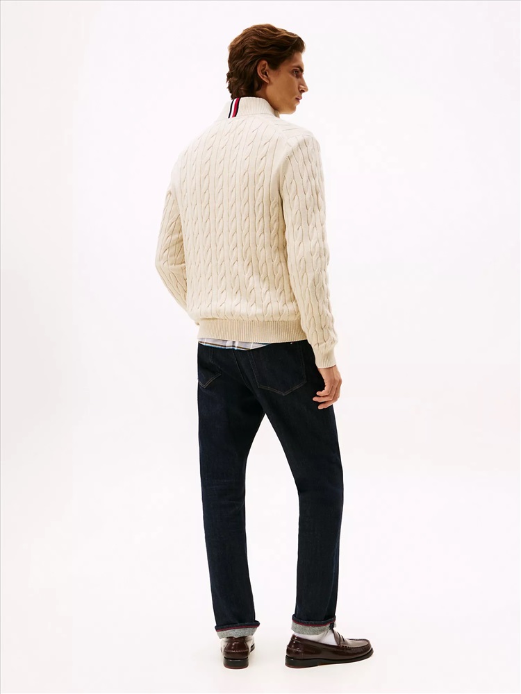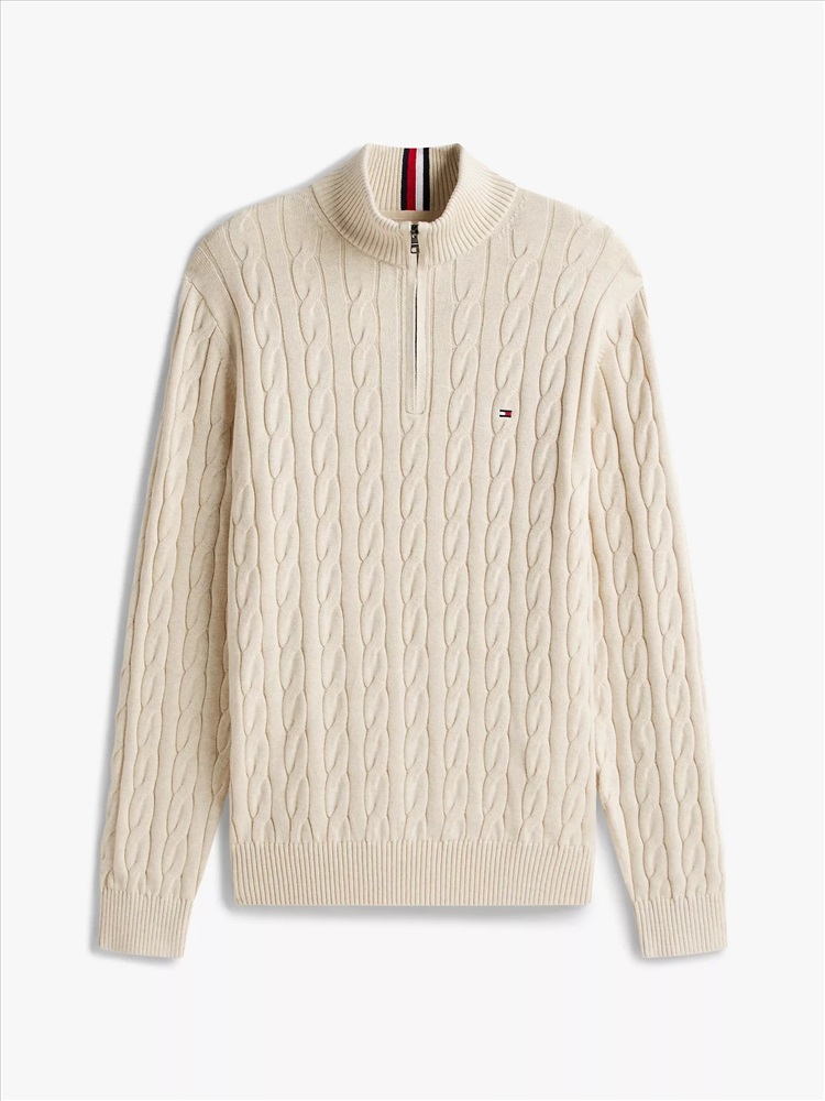 Tommy Hilfiger men's sweater. Made from combed cotton, our durable cable knit mockneck quarter-zip sweater stays soft and breathable wash after wash.
