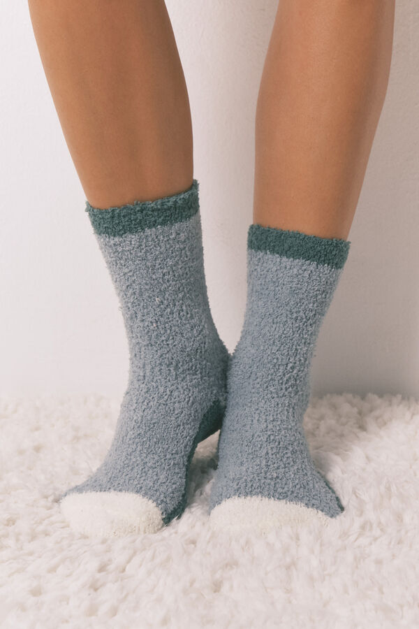 Calcetines largos con textura fluffy en tonos azules, fabricados en algodón suave y elástico. Diseñado para ofrecer comodidad y estilo durante tus actividades diarias.