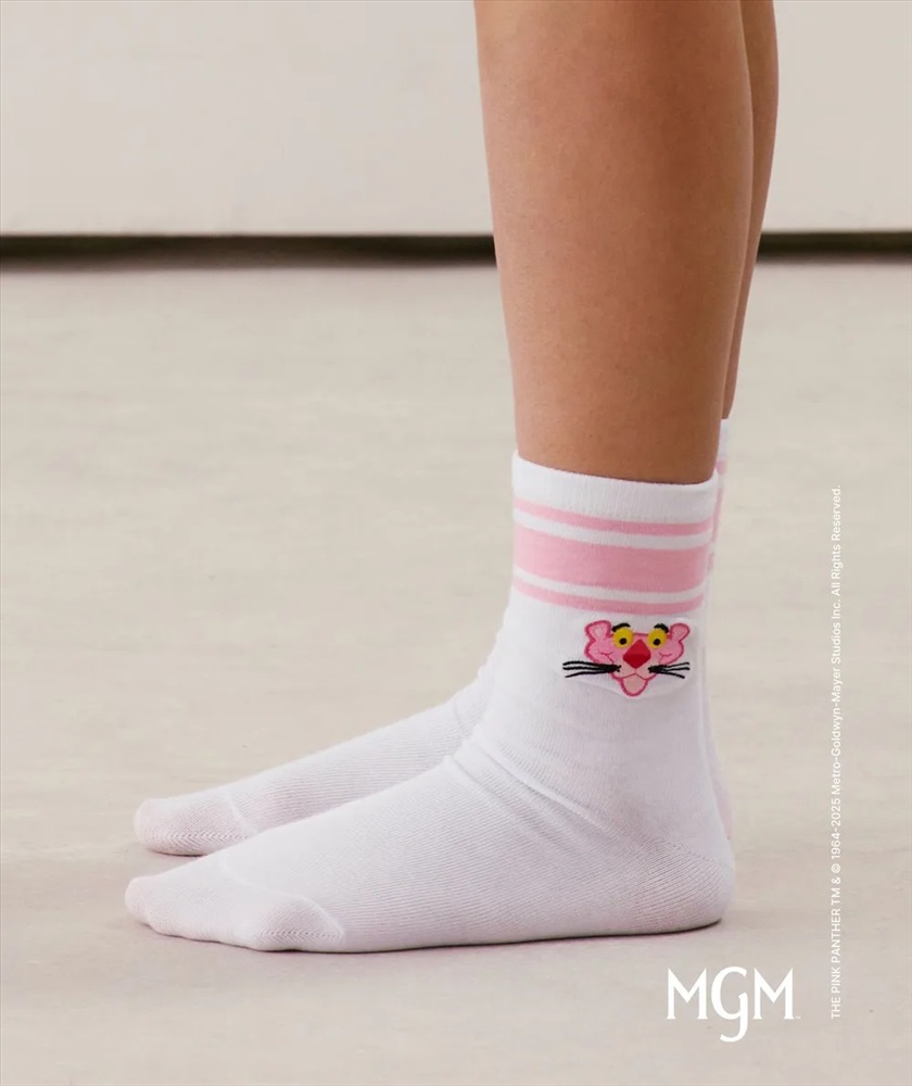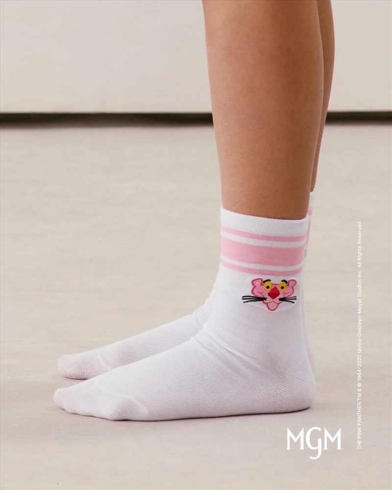 Descubre nuestros calcetines adornados con un delicado bordado de la Pantera Rosa en los laterales. Confeccionados en algodón, envuelven tus pies con suavidad y confort absoluto.