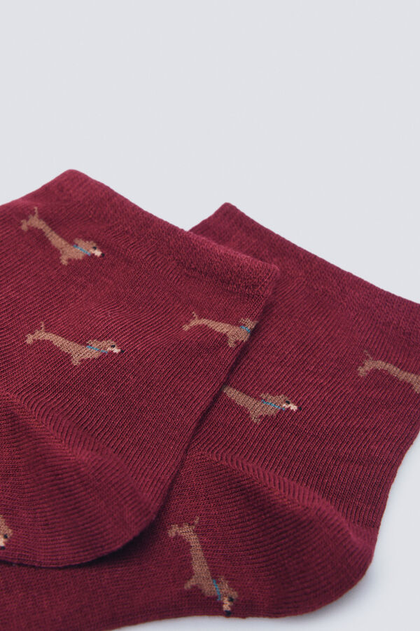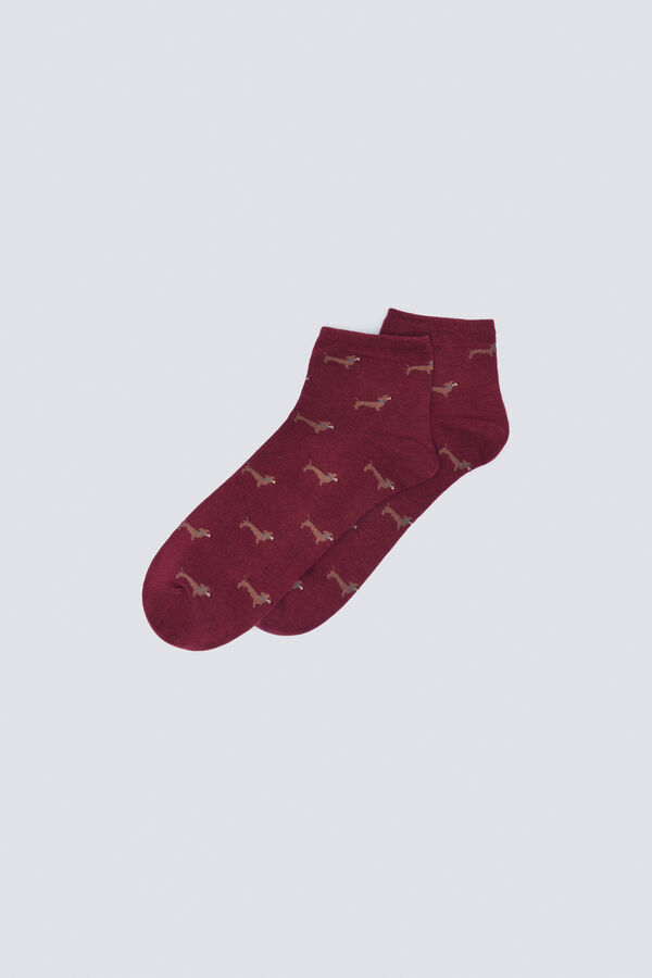 Calcetín corto de color liso, con dibujo de perros, con punta, talón y borde superior lisos.