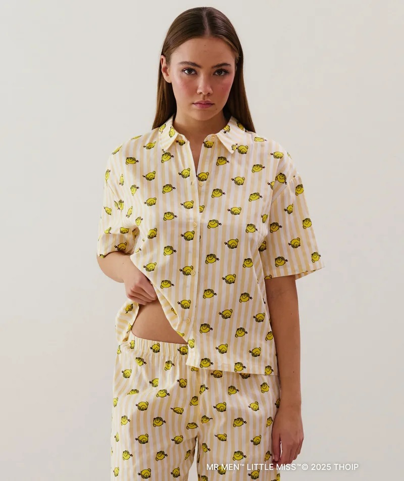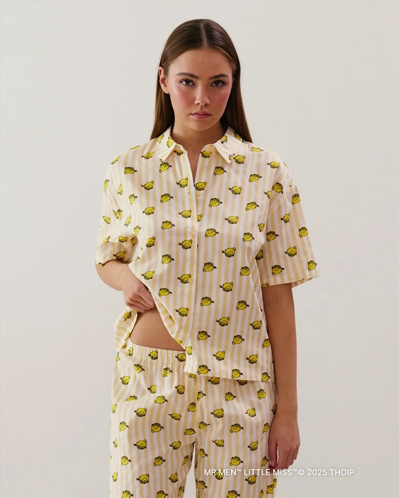 Enamórate de esta camiseta de algodón con un estampado integral de Mme Chipie sobre fondo de rayas amarillas y blancas. Completa el look con un pantalón de la misma colección. Además, forma parte de nuestra gama we care.