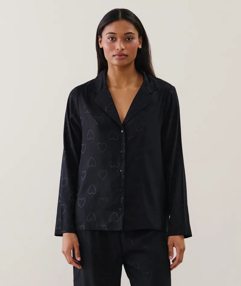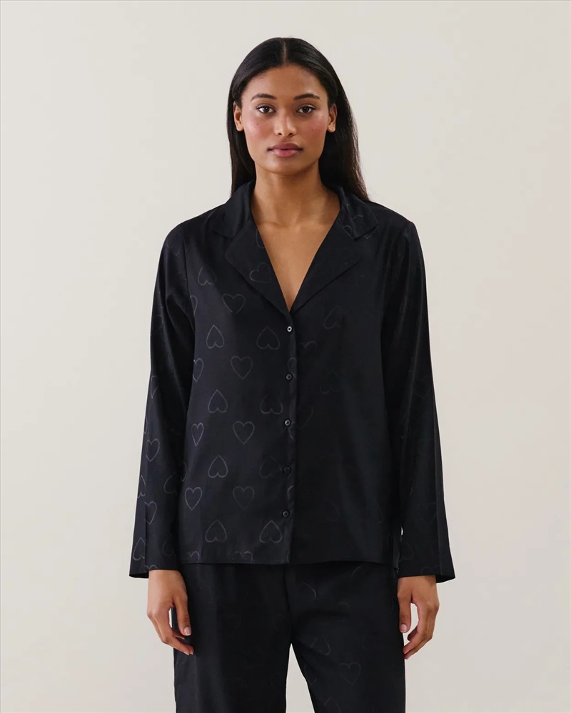 LANAIZ es una camisa de sat én muy suave, imprescindible esta temporada. Nos encanta su material favorito, ultra suave y comodo, asi como sus estampados de corazones sobre fondo negro, ¡perfectos para celebrar San Valentin! Combinala con el pantalon de la misma coleccion para un look completo. Además: forma parte de nuestra gama We care