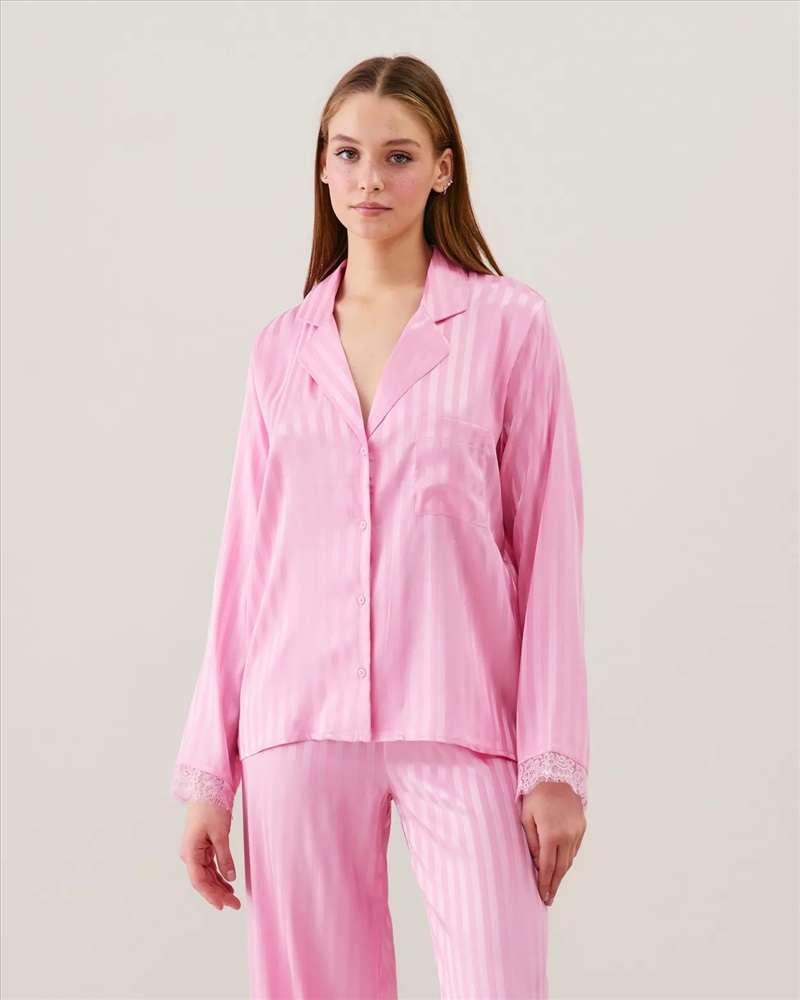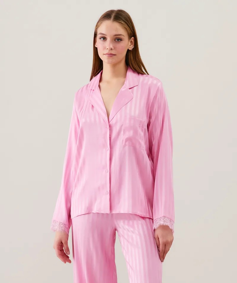 Para las futuras novias (o simplemente las amantes del satén), ¡aquí está el pijama perfecto! Esta temporada, Undiz te ofrece la camisa AMAELIZ, ideal para acompañarte en el día más hermoso de tu vida. Confeccionada en satén jacquard a rayas, está realzada por delicados detalles de encaje en los puños de las mangas. Para un look completo, combínala con el pantalón a juego de la misma colección.
