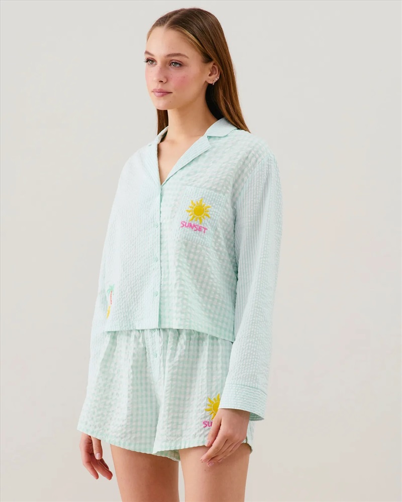 GARDENLIZ es una camisa ultra genial de seersucker. Este tejido ligero y texturizado, con su efecto gofrado, es a la vez moderno y de calidad. Su corte ligeramente corto añade un toque de moda, mientras que los detalles bordados en la parte inferior de la camisa y en el bolsillo aportan un toque de frescura con motivos veraniegos: palmera, sol, corazón. Nos encanta su mezcla de rayas y cuadros vichy en tonos verdes ultra luminosos. ¡Combínala con la parte inferior a juego para un conjunto fresco e irresistible! Además: forma parte de nuestra gama We care.