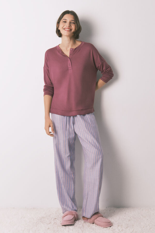 Camiseta holgada lisa de manga larga en tejido de punto super soft. Escote de cuello redondo pulido con vivo a tono y tapeta central abrochada con botones a tono. Ideal para looks cómodos y relajados.