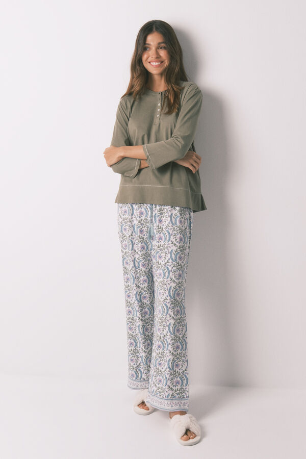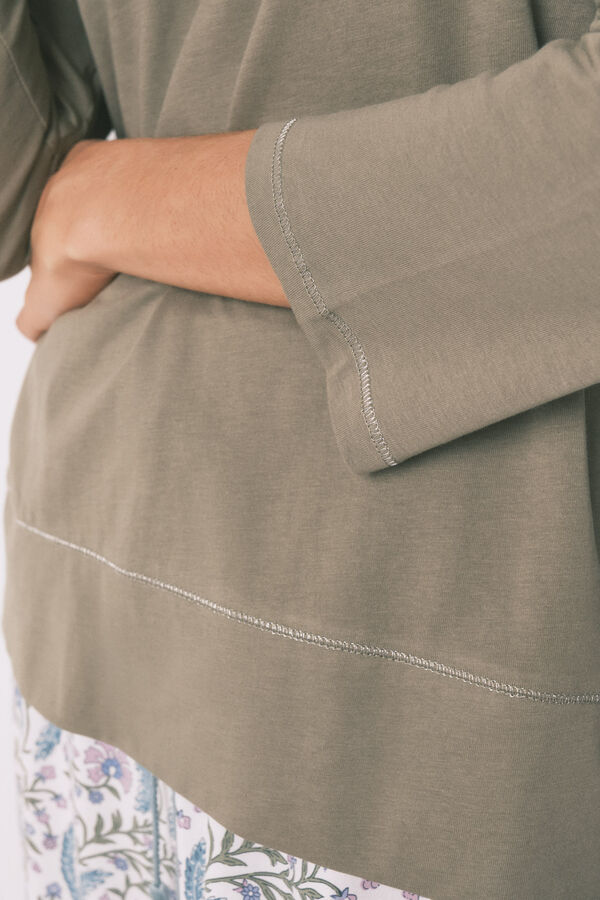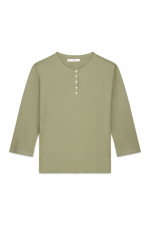 Camiseta lisa de manga ¾ en tejido de algodón. Escote redondo con tapeta frontal de botones a tono, manga caída y cenefa del mismo género en bajo con aberturas laterales. Ideal para looks casuales y cómodos.