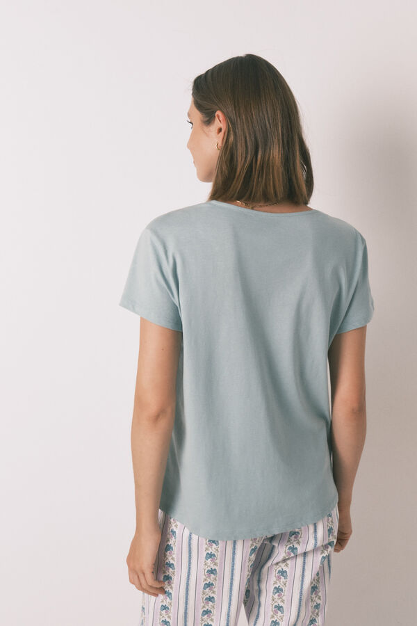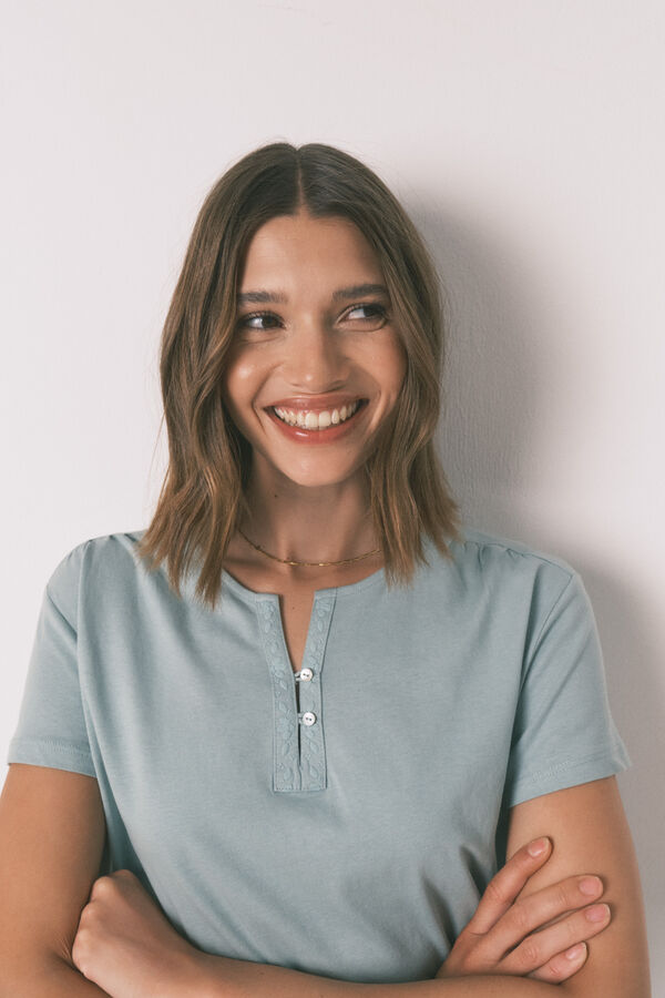 Camiseta lisa de manga corta caída en tejido 100% algodón. Top con escote redondo con corte central y abrochado con botones a tono. Ideal para looks casuales y cómodos.