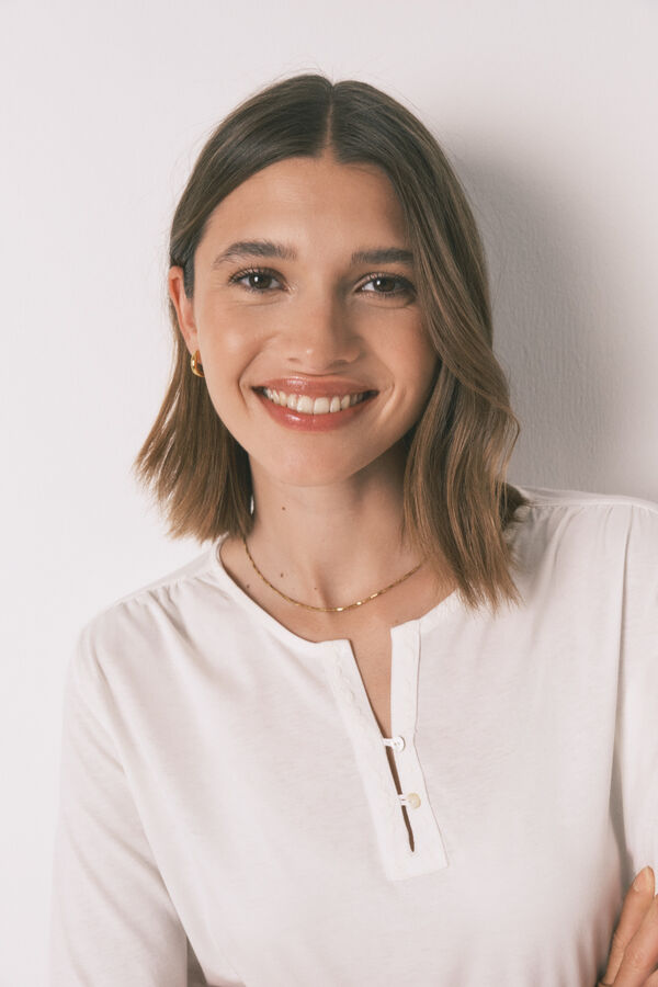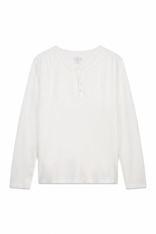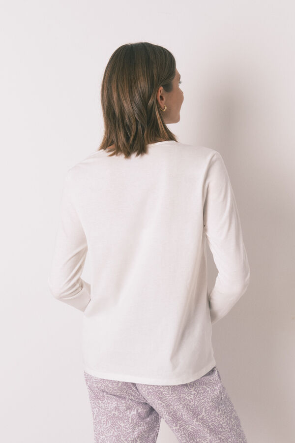 Camiseta lisa de manga larga caída en tejido 100% algodón. Top con escote redondo y corte central con estampado decorativo en el pecho. Ideal para looks casuales y cómodos.