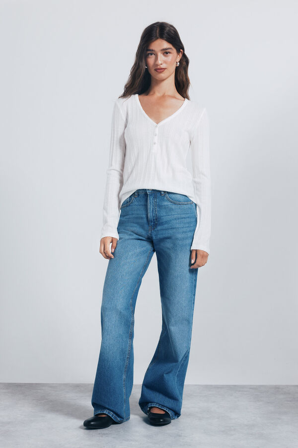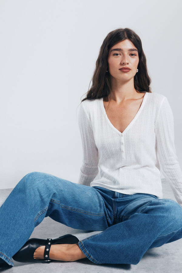 Camiseta ajustada de manga larga, con escote en uve, con tapeta con botones, con estructura y de punto cortado de color liso.