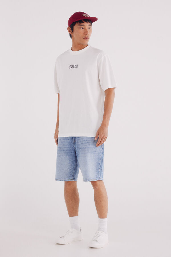 Camiseta manga corta loose fit . Cuello redondo de canalé con bordado en el pecho y estampado en la espalda.