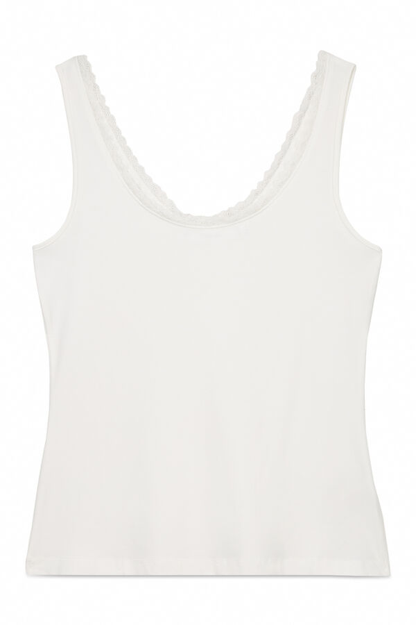 Camiseta de tirantes en tejido de algodón elástico. Cuello pico y detalle de blonda elástica alrededor del escote. Ideal para looks casuales y cómodos.