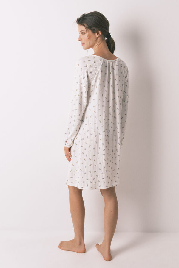 Camisón holgado midi con estampado allover de flores en tejido 100% algodón canalé. Con escote redondo pulido con vivo del mismo género que se convierte en una lazada frontal con corte. Puños fruncidos con goma creando un pequeño volante. Ideal para dormir o estar en casa muy cómoda.