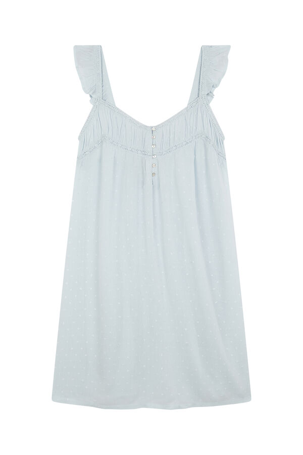 Camisón de la colección de maternity, confeccionado en tejido bambula de viscosa ECOVERO™. Largo midi y escote en pico con dos cortes con puntilla a tono. Ideal para llevar a juego con una bata: es el conjunto perfecto.