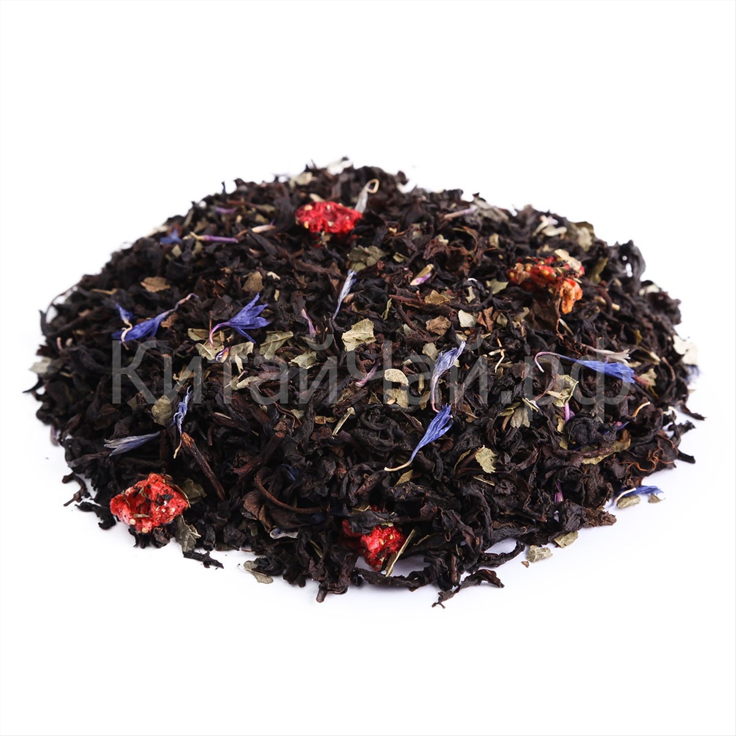 Черный индийский чай Ассам, рубленый клубничный лист и кусочки клубники, лепестки василька, аромат игристого шампанского.