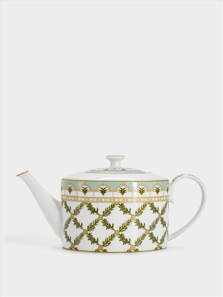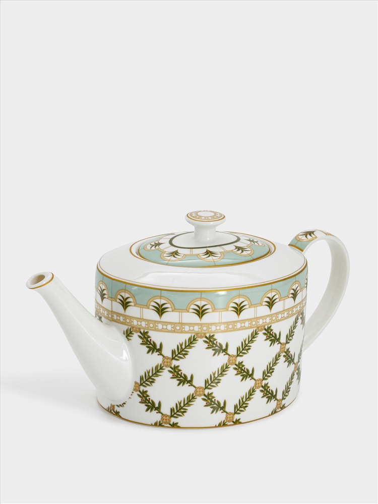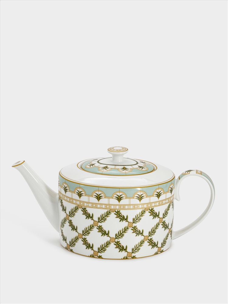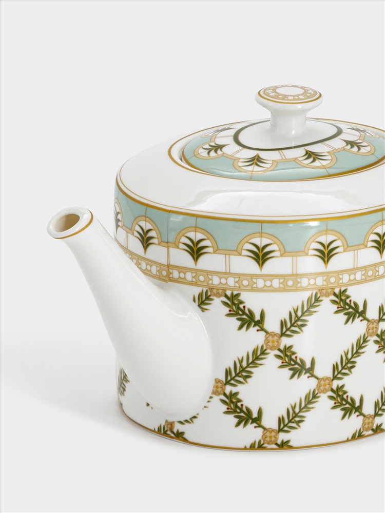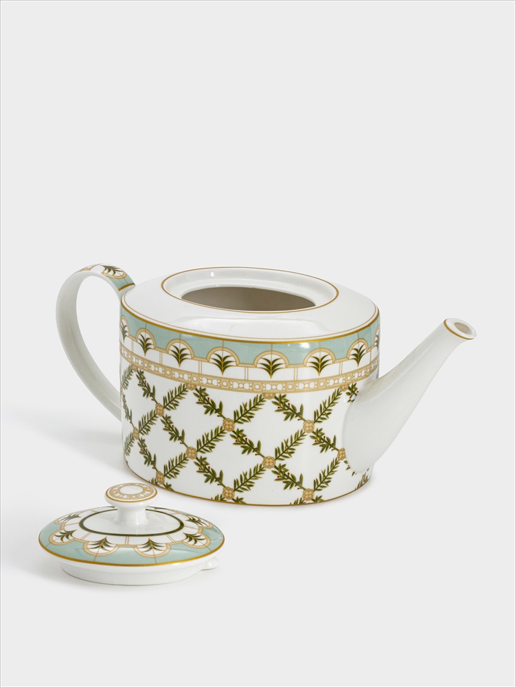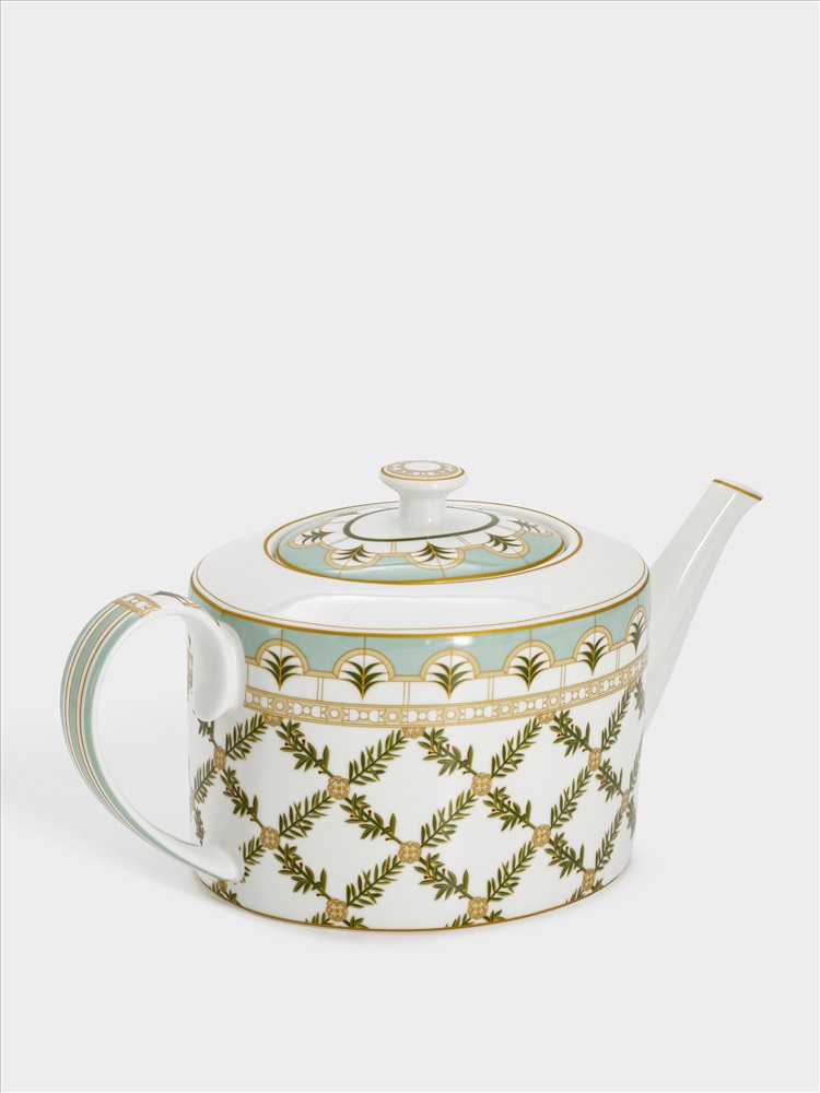 Чайник, 1,2 л, фарфор N, белый, Еловые ветви, с серо-зеленой полосой, Rosita. Материал: фарфор New Bone China. Мыть тёплой водой с применением ЖМС. Можно использовать в СВЧ и мыть в посудомоечной машине.