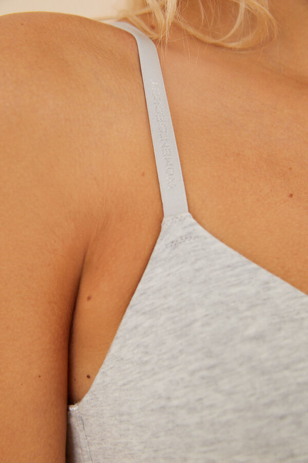 - Sujetador triangular de algodón. - Con relleno y sin aro. - Color gris. Para asegurar sujeción y confort, el modelo cambia según la talla: - Tirantes ajustables y finos en la talla 90C. - Tirantes anchos con espalda anatómica desde la talla 95C/90D.