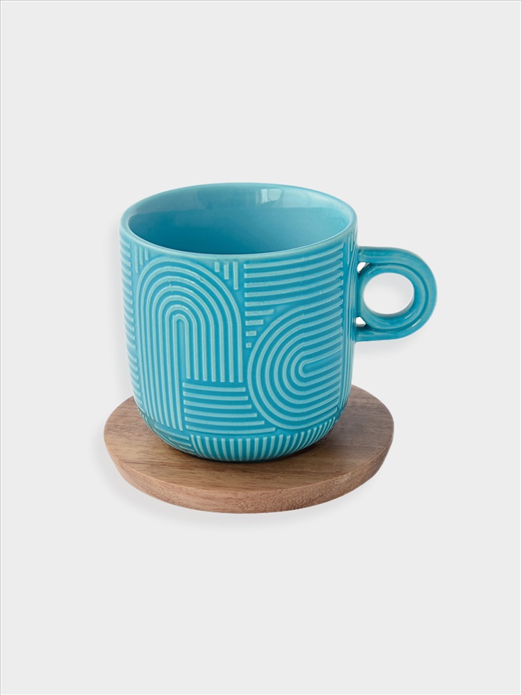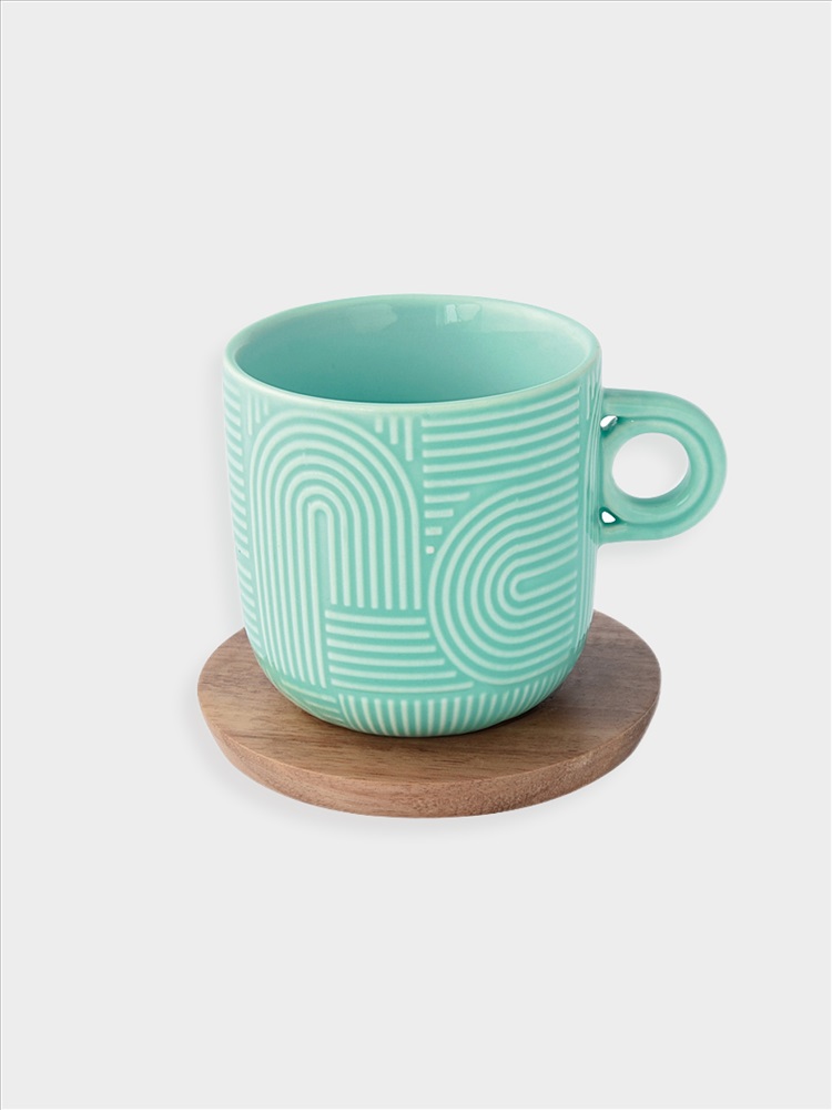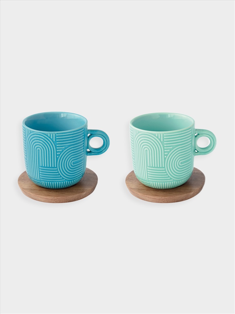 Чашка, 250 мл, 2 шт, на подставке, фарфор P/дерево, голубой/зеленый, Take a loop. Материал: фарфор Рorcelain, акация. Мыть тёплой водой с применением ЖМС. Можно использовать в СВЧ и мыть в посудомоечной машине (кроме крышки-подставки).