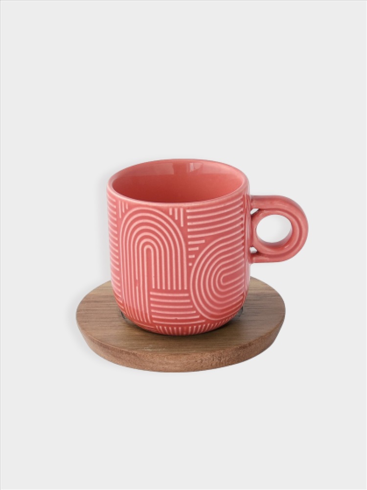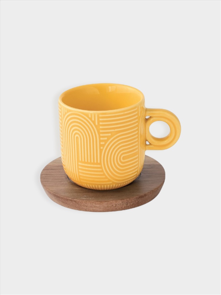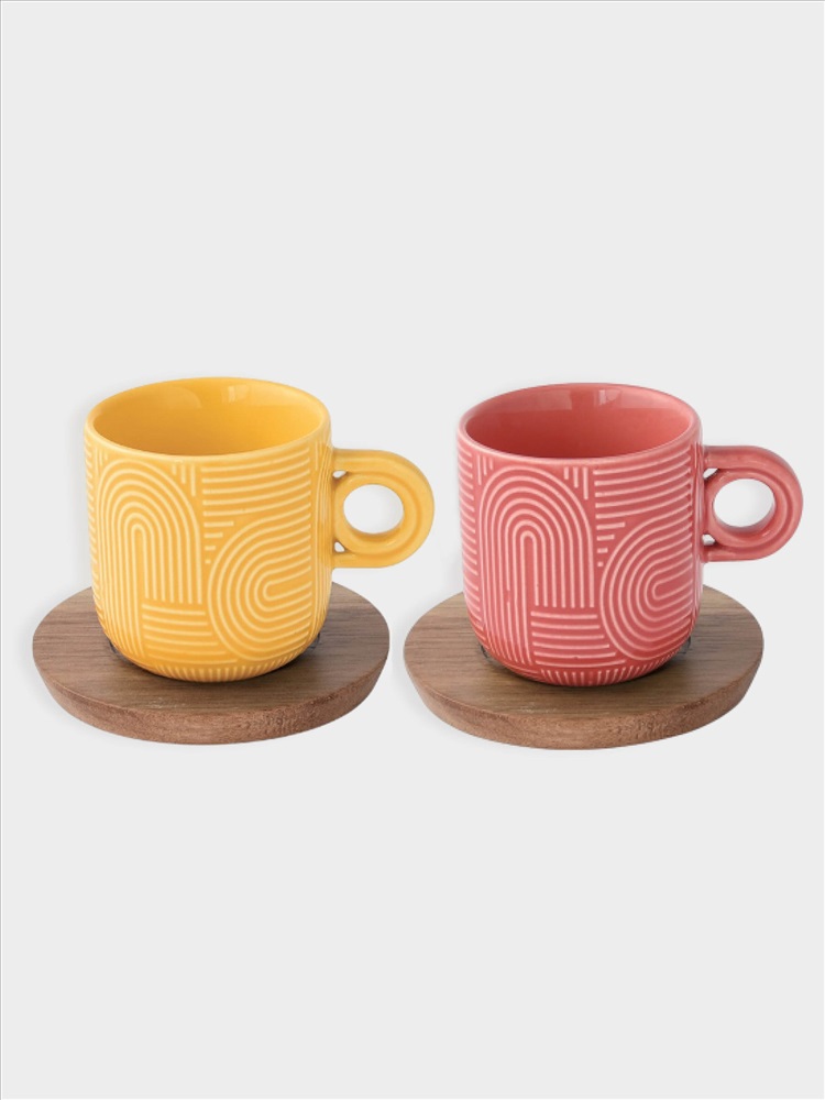 Чашка, 250 мл, 2 шт, на подставке, фарфор P/дерево, красный/желтый, Take a loop. Материал: фарфор Рorcelain, акация. Мыть тёплой водой с применением ЖМС. Можно использовать в СВЧ и мыть в посудомоечной машине (кроме крышки-подставки).