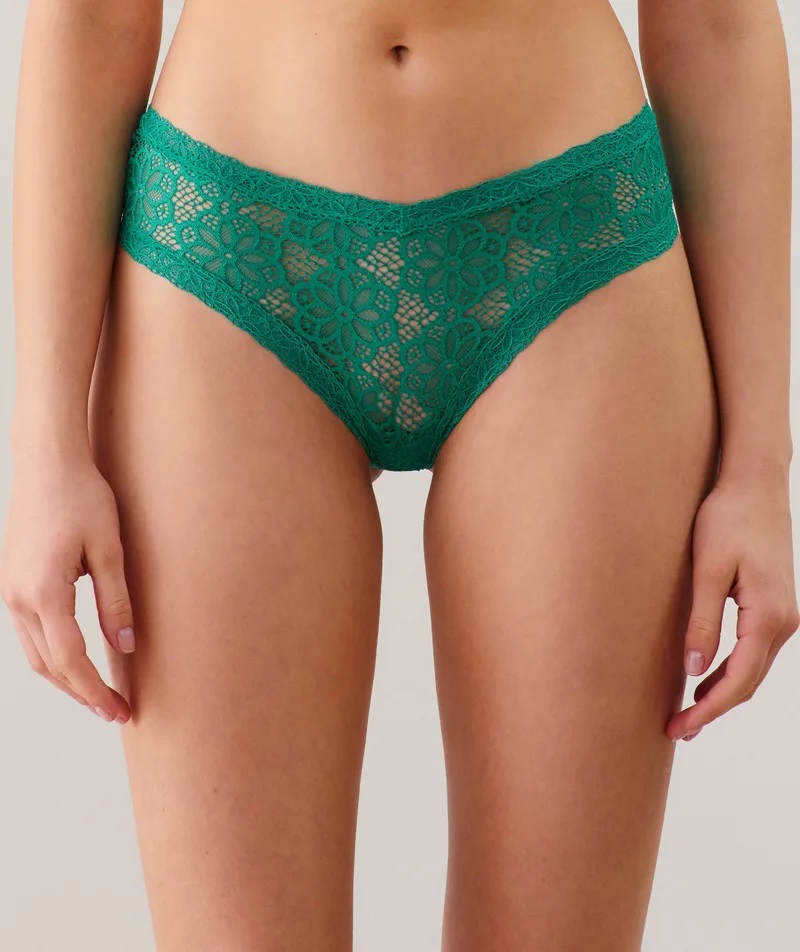 Déjate seducir por nuestro cheeky de encaje ANAKIZ-CHEEKY en verde esmeralda. Con un encaje trabajado para añadir un toque de sensualidad. ¡Completa tu armario con esta pieza atemporal! Además: ¡forma parte de nuestra gama we care!