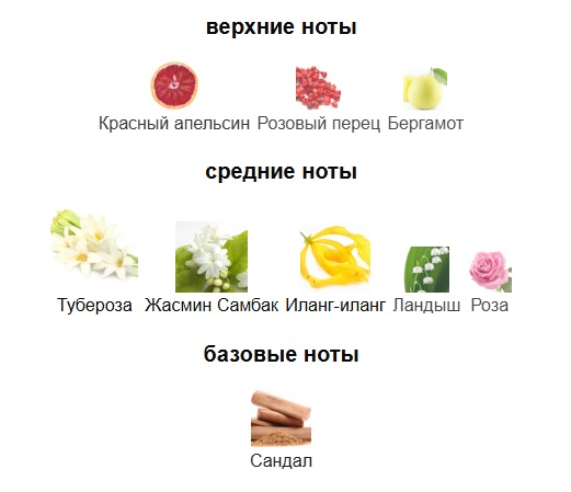 Верхние ноты: Красный апельсин, Розовый перец и Бергамот; средние ноты: Тубероза, Жасмин Самбак, Иланг-иланг, Ландыш и Роза; базовая нота: Сандал.