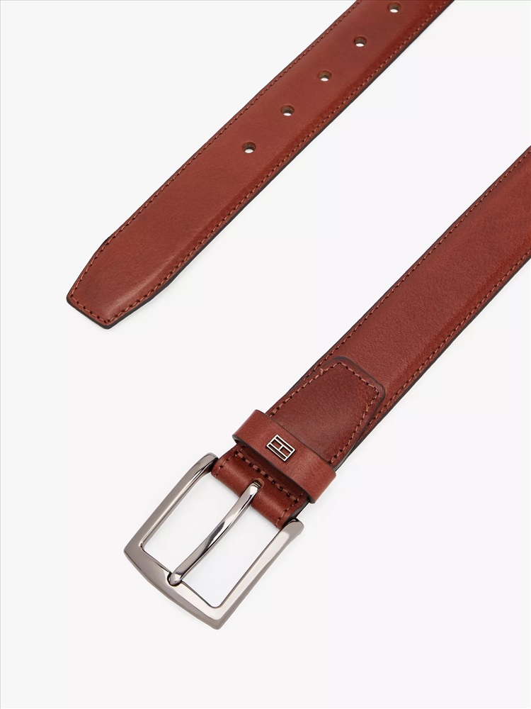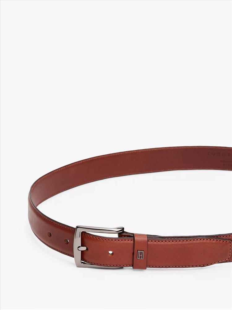 Tommy Hilfiger men's belt. Add a touch of polish to your outfits with this smooth leather belt featuring a gleaming square metal buckle and signature flag hardware.