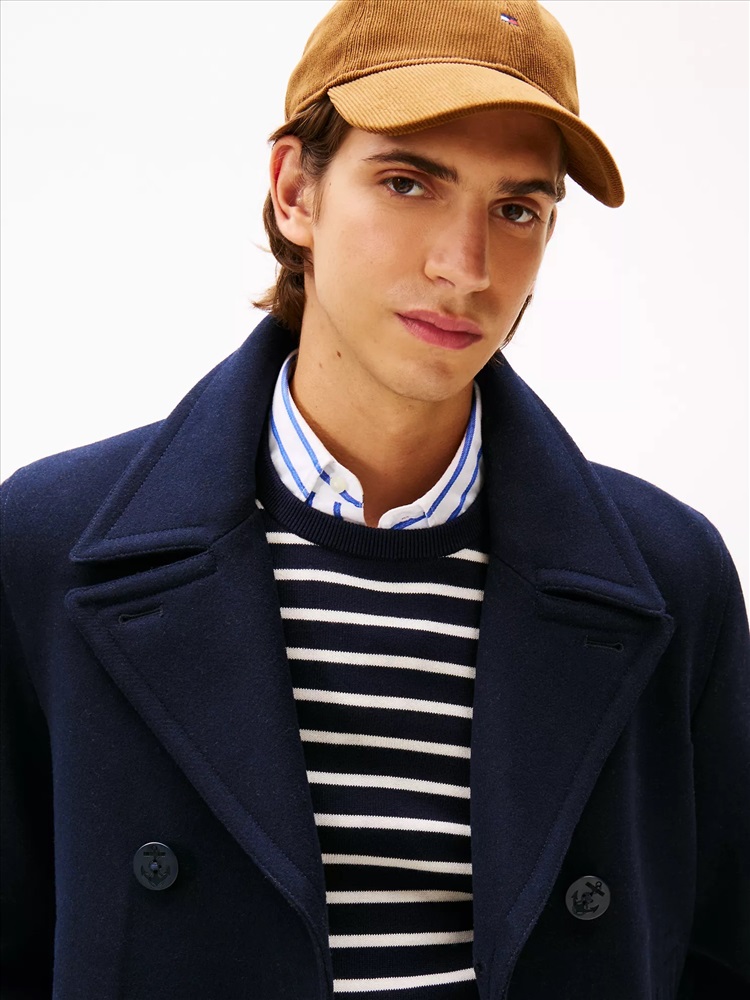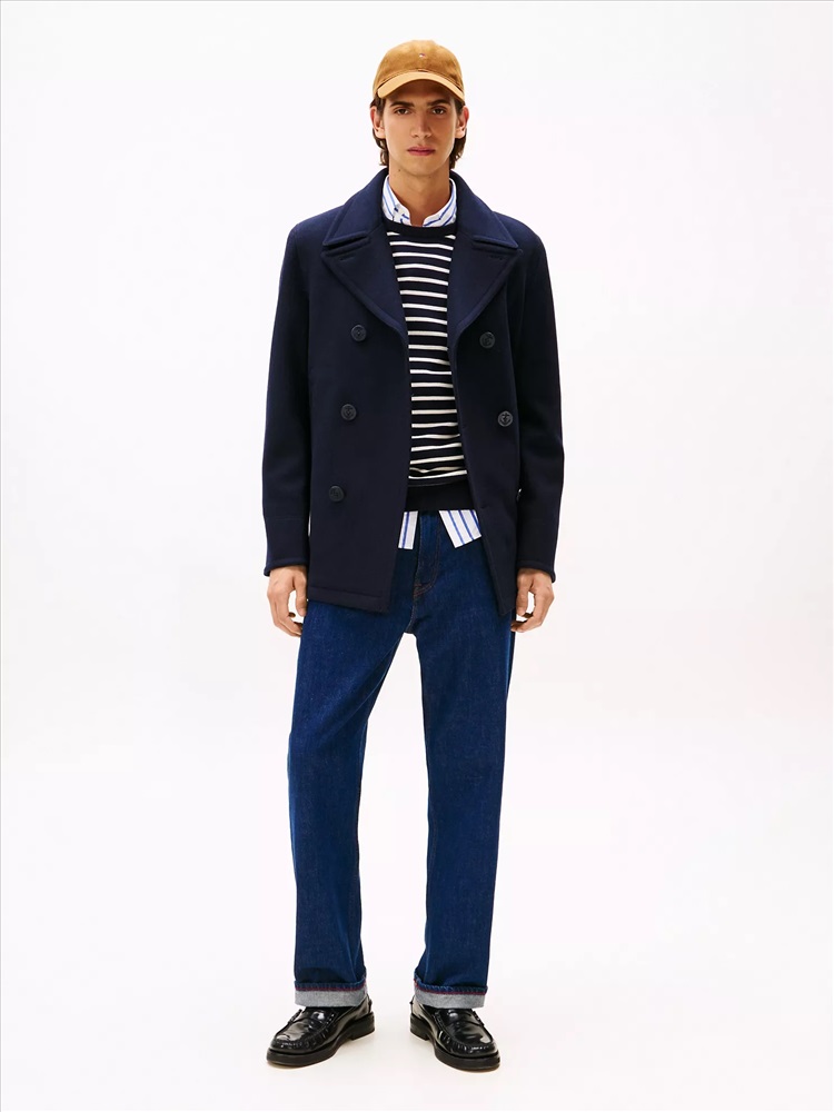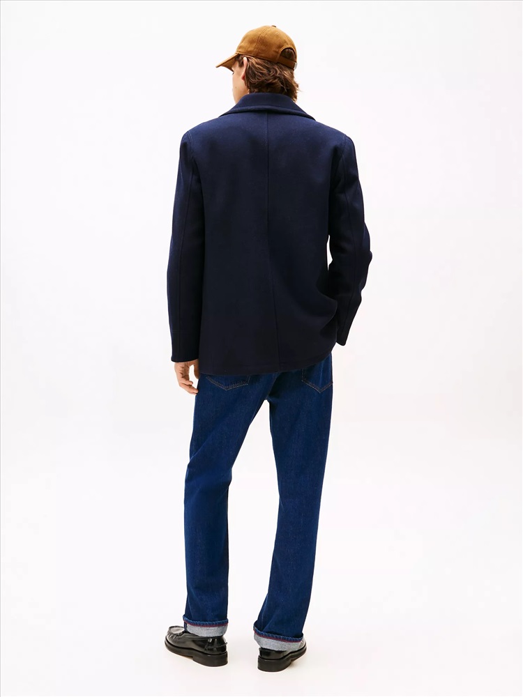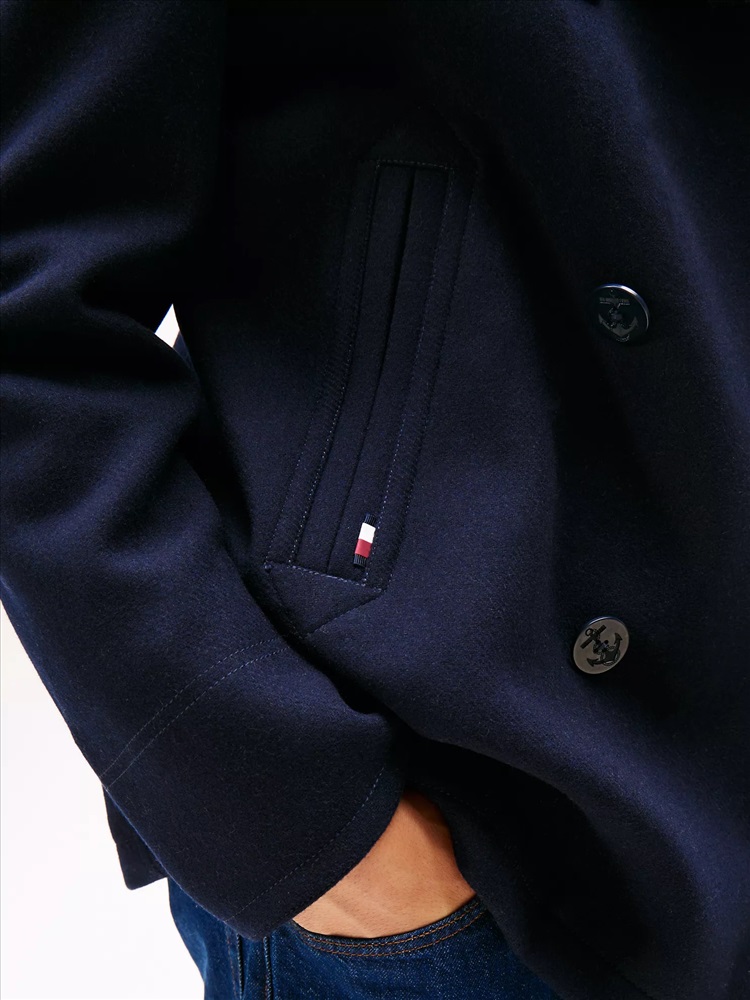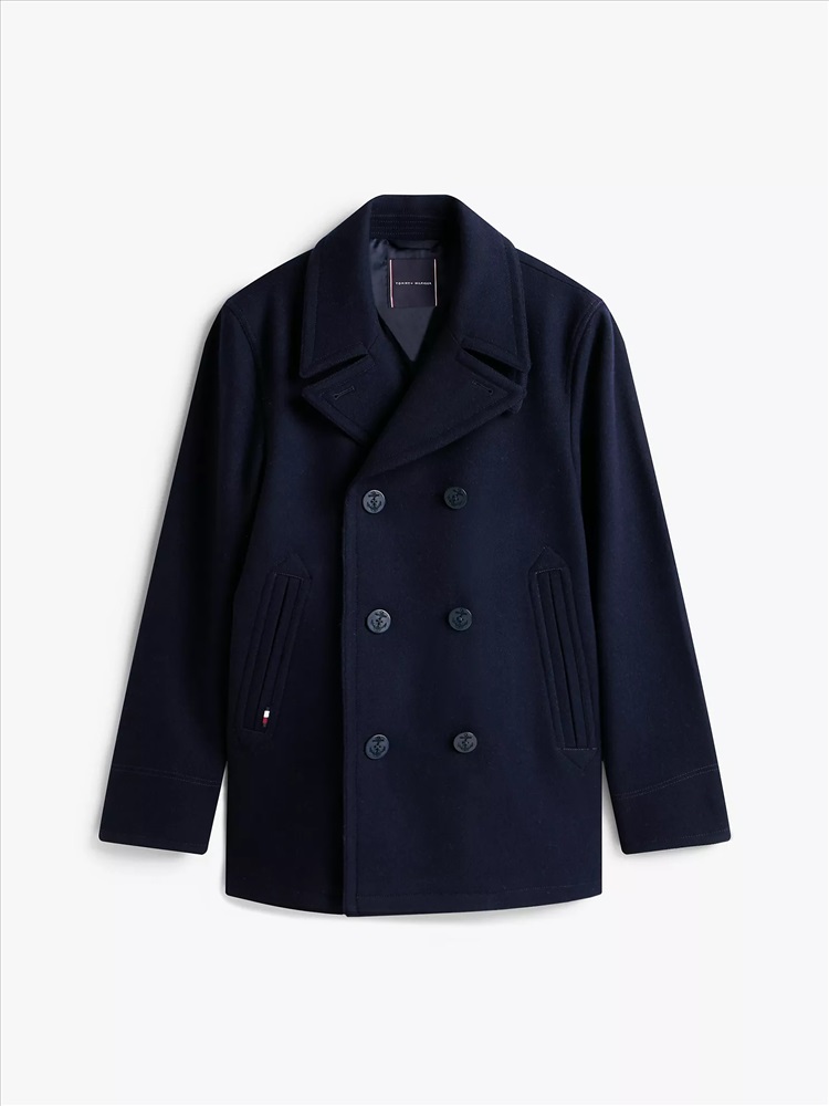 Tommy Hilfiger men's coat. Our timeless double-breasted peacoat features notched lapels and welt pockets. The removable throat tab used to pull the collar together for added protection against the elements. When not in use, the tab stores neatly inside the back collar. This outer layer is made from an insulating wool blend, so you'll feel warm without the bulk.