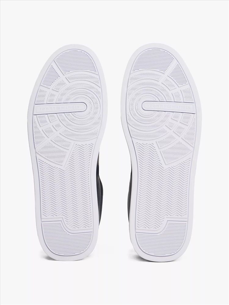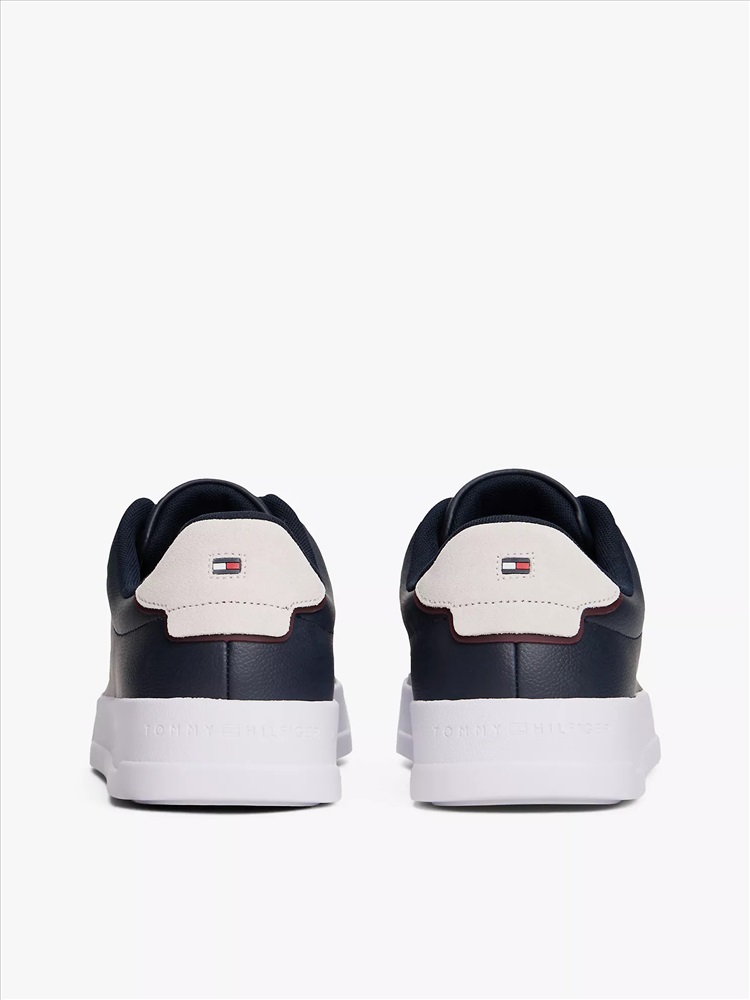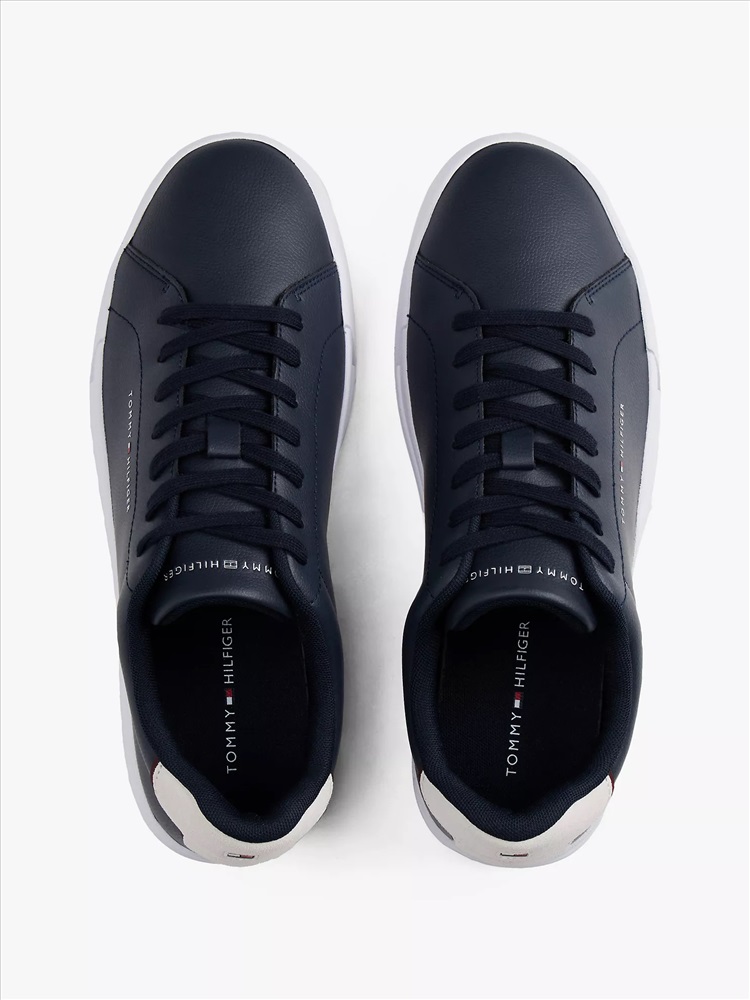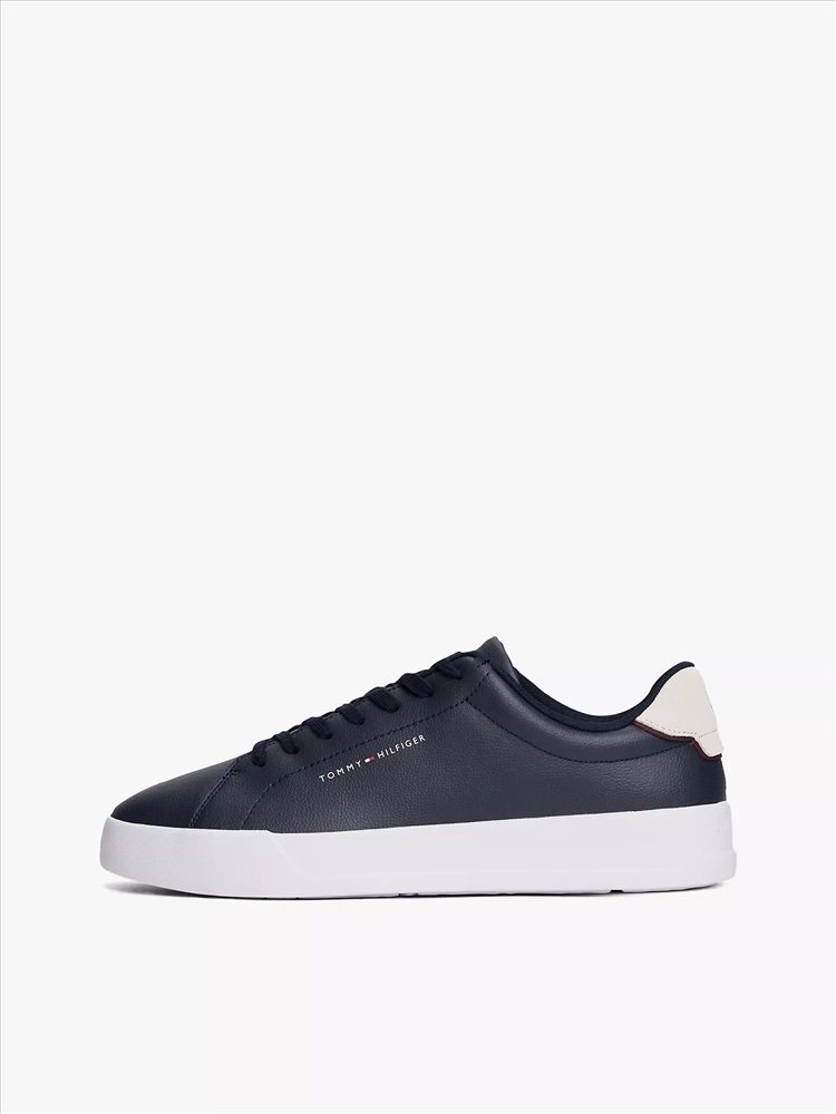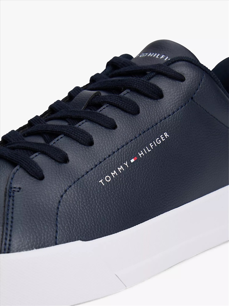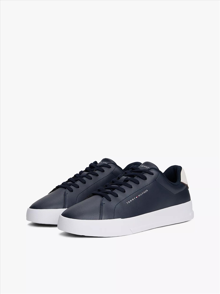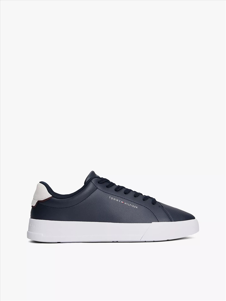 Tommy Hilfiger men's sneaker. Sign off your look with these coated leather low-top court sneakers, designed with a flexible, grippy gum sole and our Hilfiger logo.