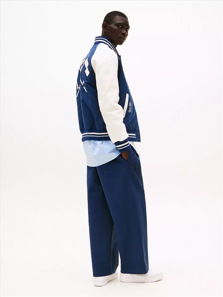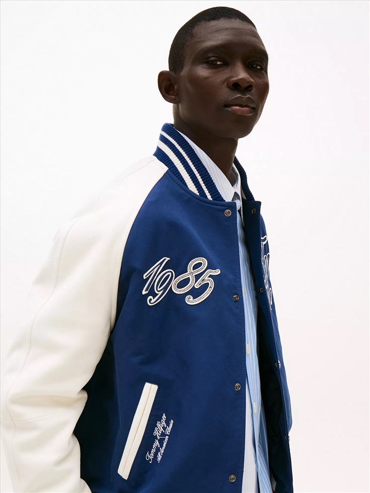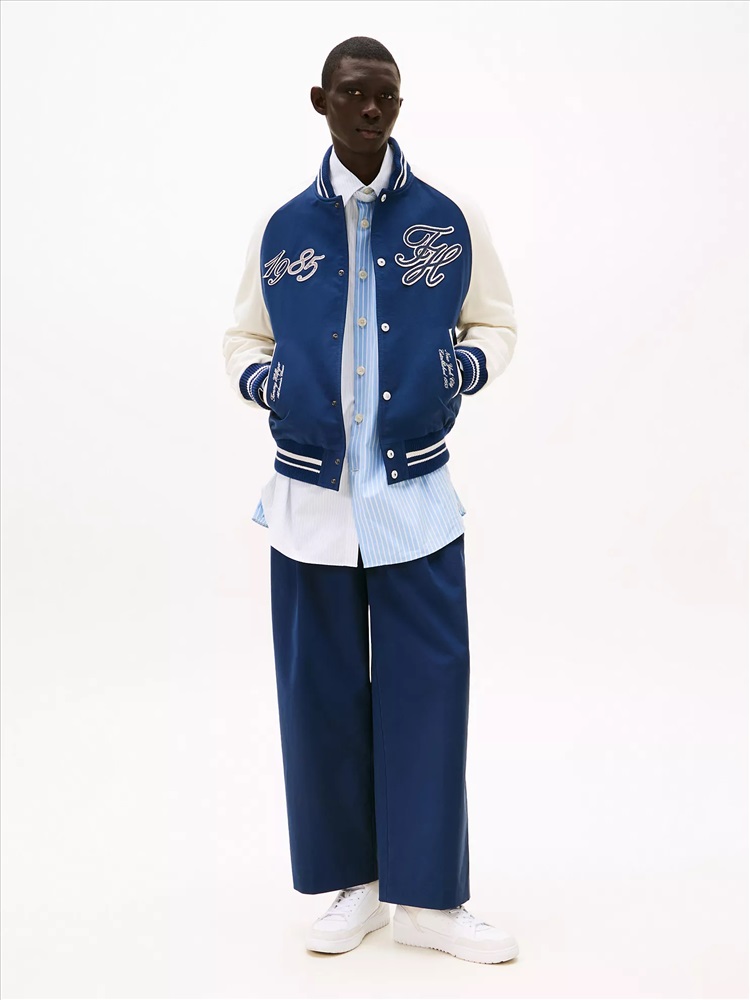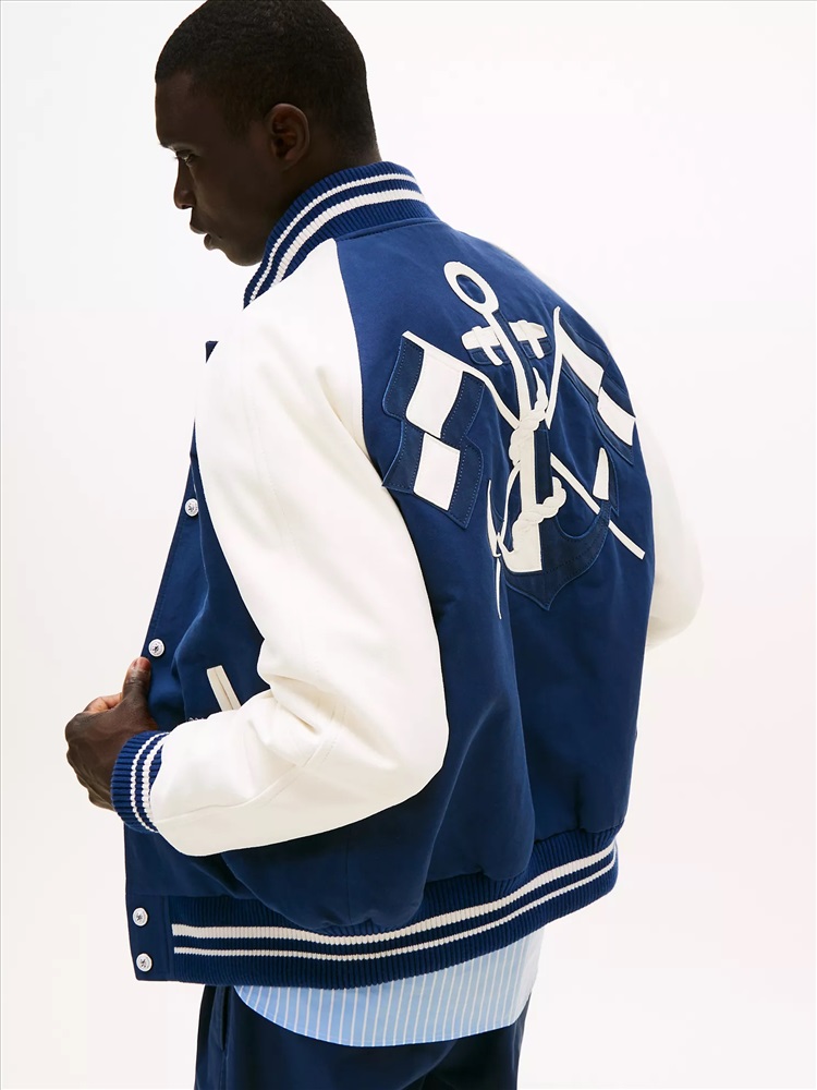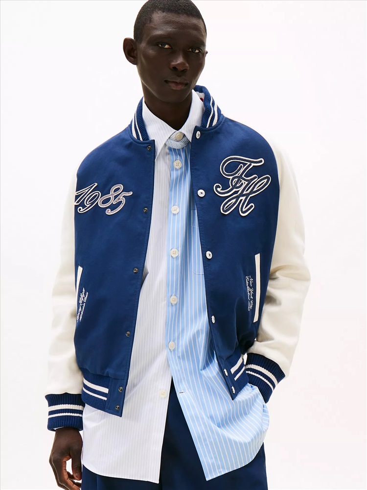 Tommy Hilfiger men's jacket. Sporting a mix of logos at the front and our nautical logo at the back, this bomber jacket captures the retro varsity trend while remaining totally fresh for today. A limited-edition style from our Spring 2025 runway collection.