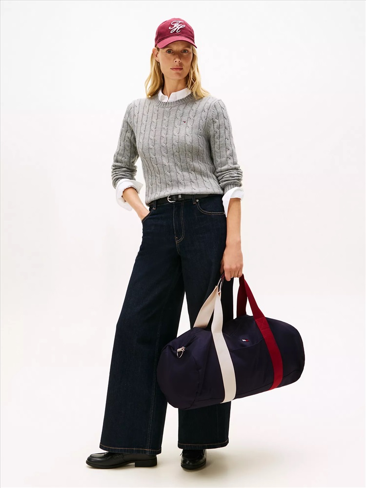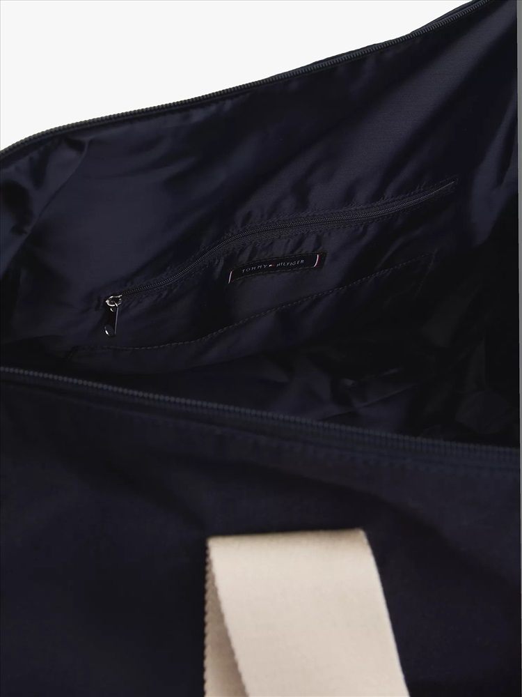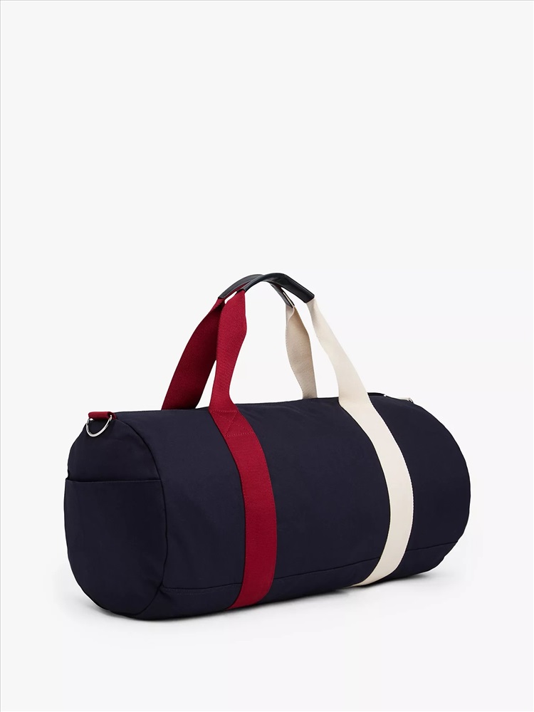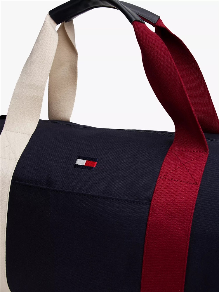 Tommy Hilfiger men's bag. Our sturdy duffle features a no-fuss open interior to tote your essentials to the gym, on a weekend jaunt, or wherever the day may take you. Made from cotton canvas, it's built to take anything you can throw at it (or in it).