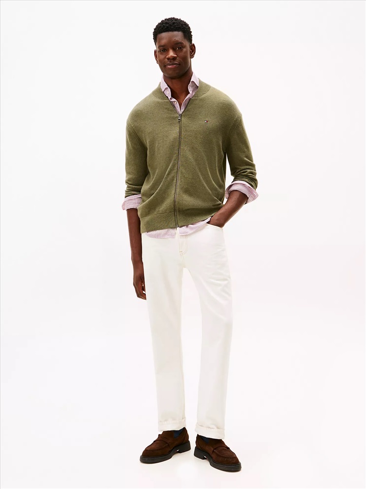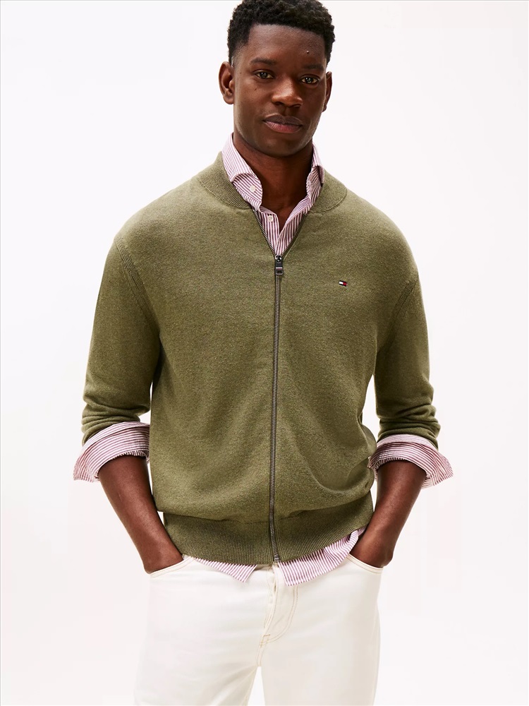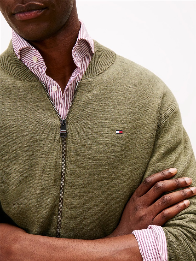 Tommy Hilfiger men's sweater. Tackle fickle weather with our bomber-inspired cotton zip cardigan, featuring a varsity style baseball collar and ribbed trim.