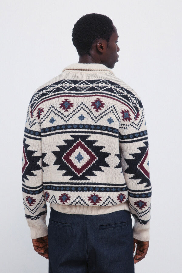 Cárdigan grueso estructura en hilatura fantasía aspecto lana con dibujo de rombos. Cuello polo. Bajos y puños en canalé.
