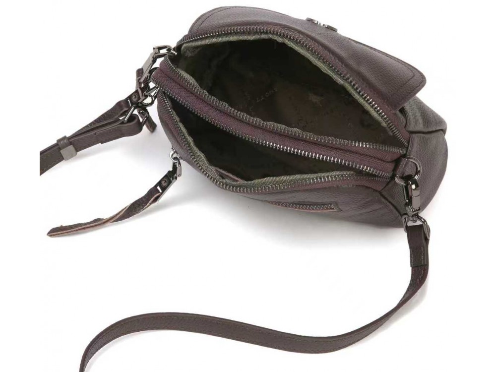 Сумка кросс-боди. В комплекте кожаный ремень с возможностью регулировки. Два основных отделения. Внутри: два кармана для аксессуаров, один из которых застегивается на молнию. Снаружи: спереди вместительный отдел под клапаном на магнитной клепке. Сзади: карман для мелочей на молнии.