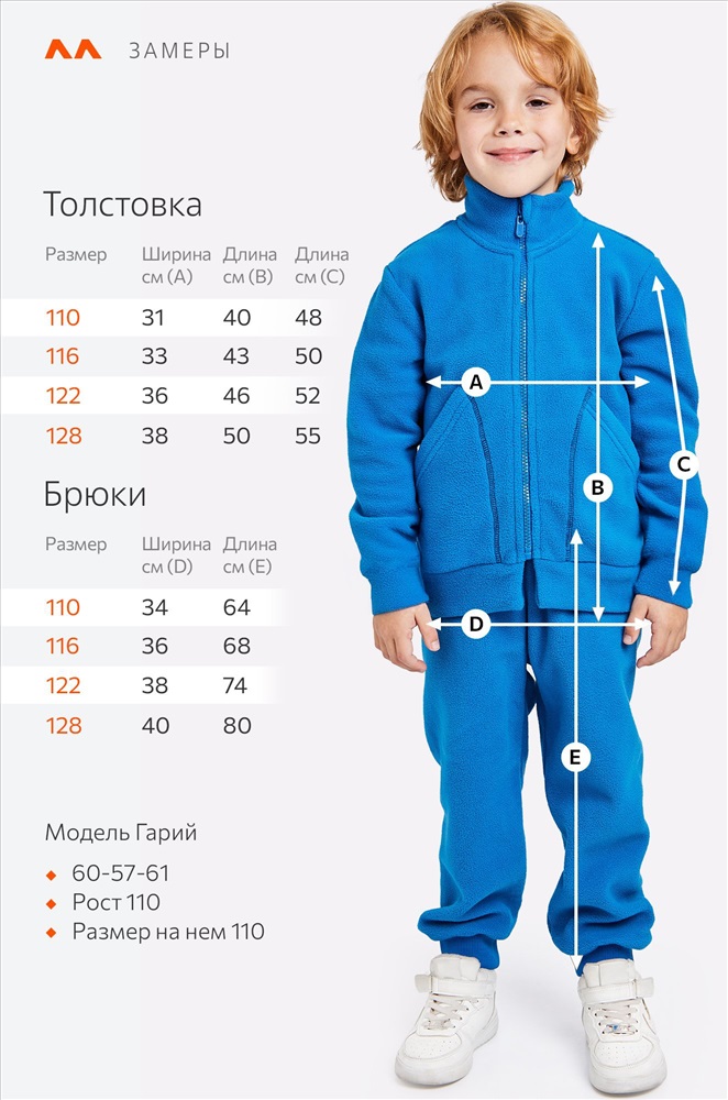 брюки: длина внеш. шва:64 см; длина внут. шва:42 см; ширина по бёдрам:34 см. Размер 116: кофта: длина:43 см; ширина:33 см; длина рукава внешняя:50 см; длина рукава внутренняя:33 см. брюки: длина внеш. шва:68 см; длина внут. шва:46 см; ширина по бёдрам:36 см. Размер 122: кофта: длина:46 см; ширина:36 см; длина рукава внешняя:52 см; длина рукава внутренняя:36 см. брюки: длина внеш. шва:74 см; длина внут. шва:50 см; ширина по бёдрам:38 см. Размер 128: кофта: длина:50 см; ширина:38 см; длина рукава внешняя:55 см; длина рукава внутренняя:38 см. брюки: длина внеш. шва:80 см; длина внут. шва:56 см; ширина по бёдрам:40 см. *замеры выборочные, могут незначительно отличаться. Комментарии к товару