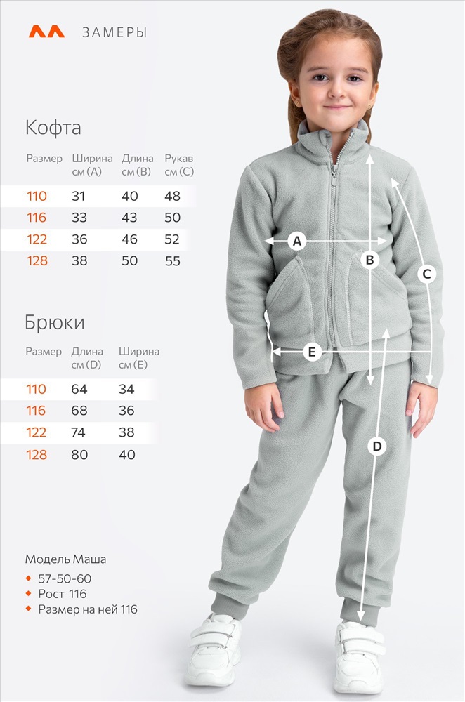 Размер 116: кофта: длина:43 см; ширина:33 см; длина рукава внешняя:50 см; длина рукава внутренняя:33 см.