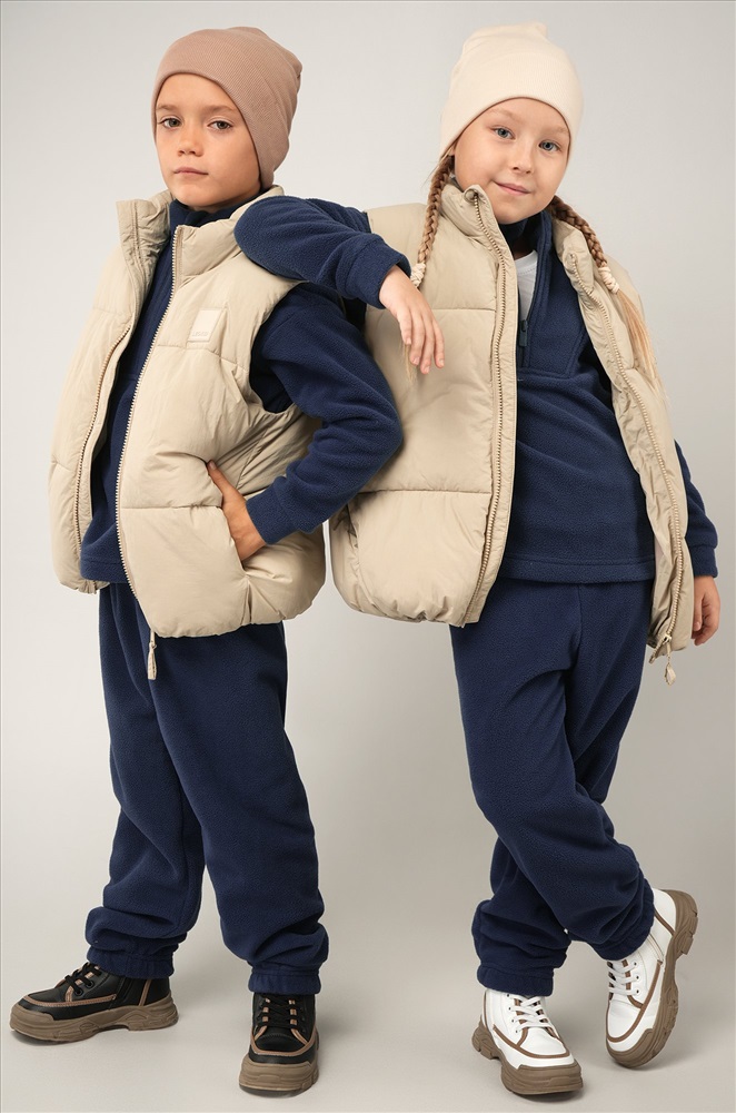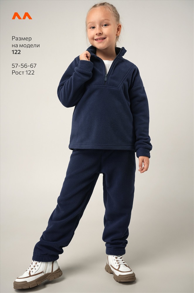 Преимущества: – плотный флис 280 г/м², удерживающий тепло; – однотонный синий цвет, практичный и универсальный; – удобная толстовка со воротником стойкой и короткой молнией; – штаны прямого кроя на резинке с манжетами; – базовый фасон, удобный для повседневки. Толстовка и брюки из флиса делают этот зимний костюм надёжным выбором для детей. Он помогает заботливо защитить от холода и подарить комфорт в каждый зимний день. Рост девочки 122 см, параметры: объем груди 57, объем талии 56, объем бедер 67. На ней размер 122. Рост мальчика 118 см, параметры: объем груди 52, объем талии 55, объем бедер 58. На нейм размер 122.