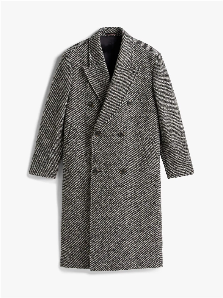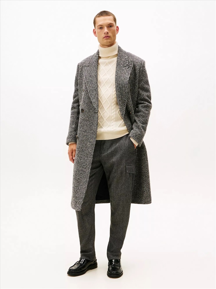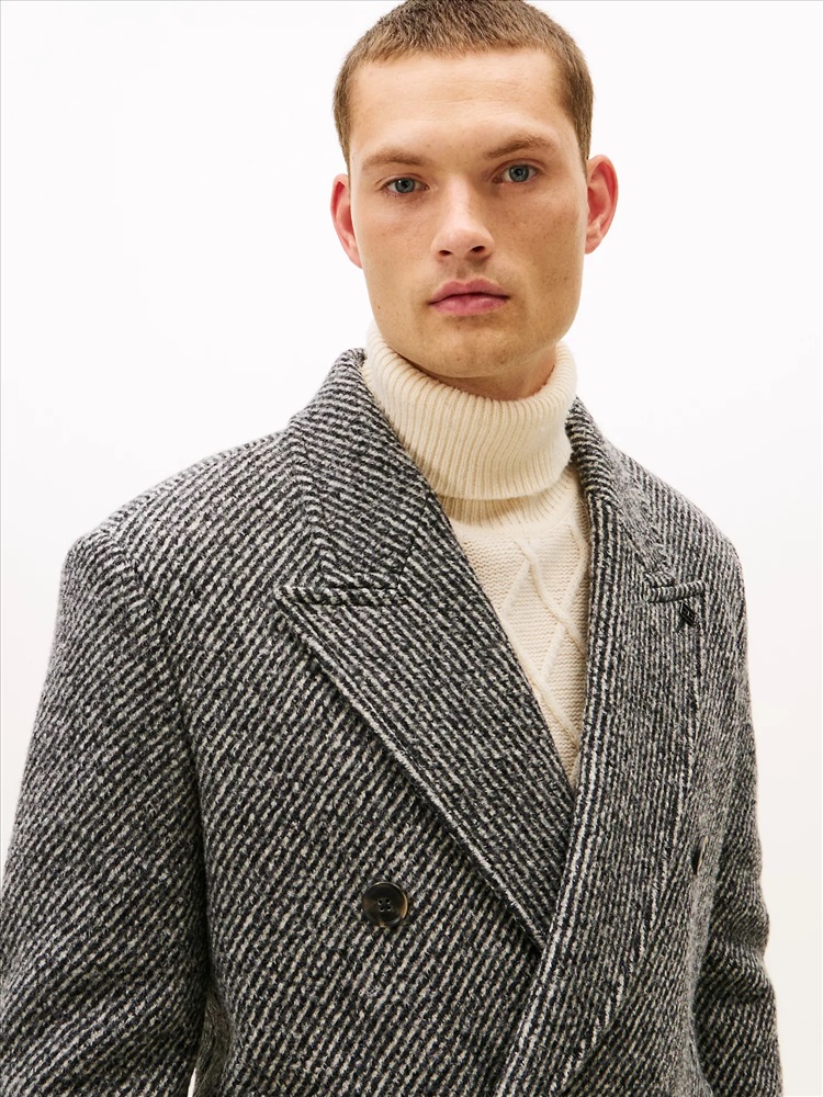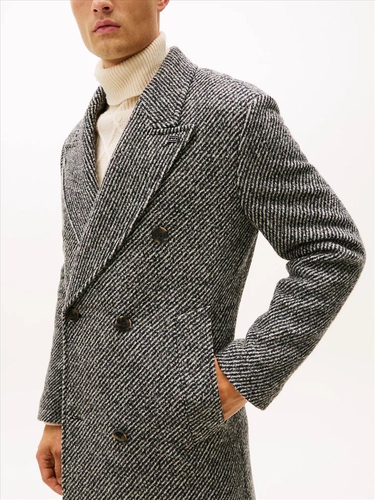 Tommy Hilfiger men's coat. This classic tweed double-breasted coat is the cornerstone of your outerwear collection. Made from boiled wool for superior warmth and finished with notched lapels, the tailored silhouette and timeless details elevate even your most casual ensembles.