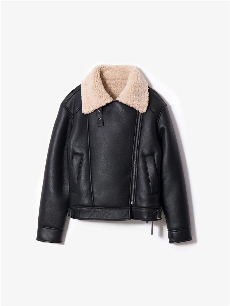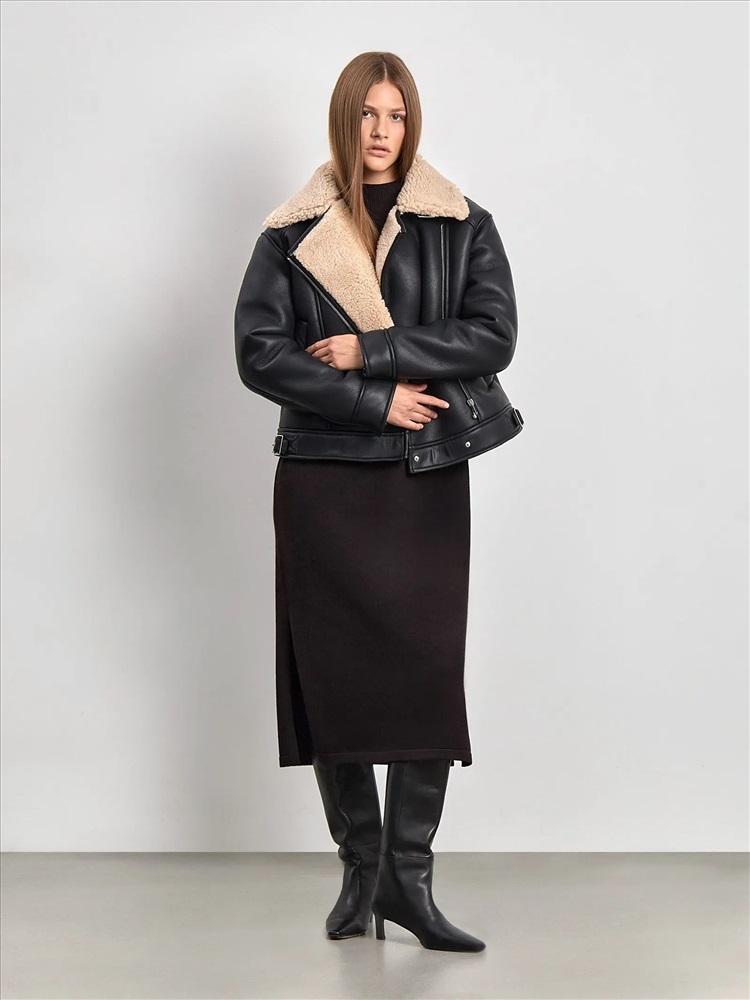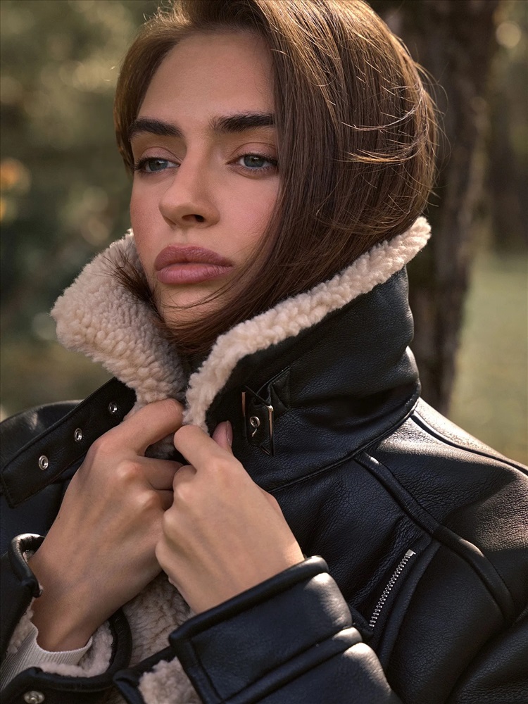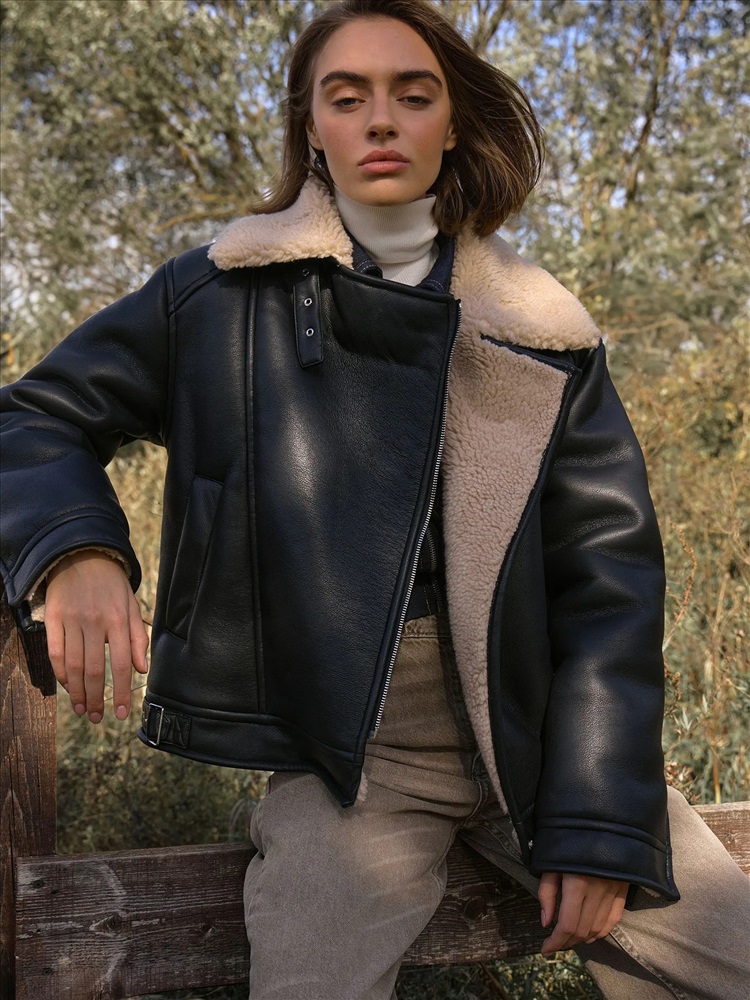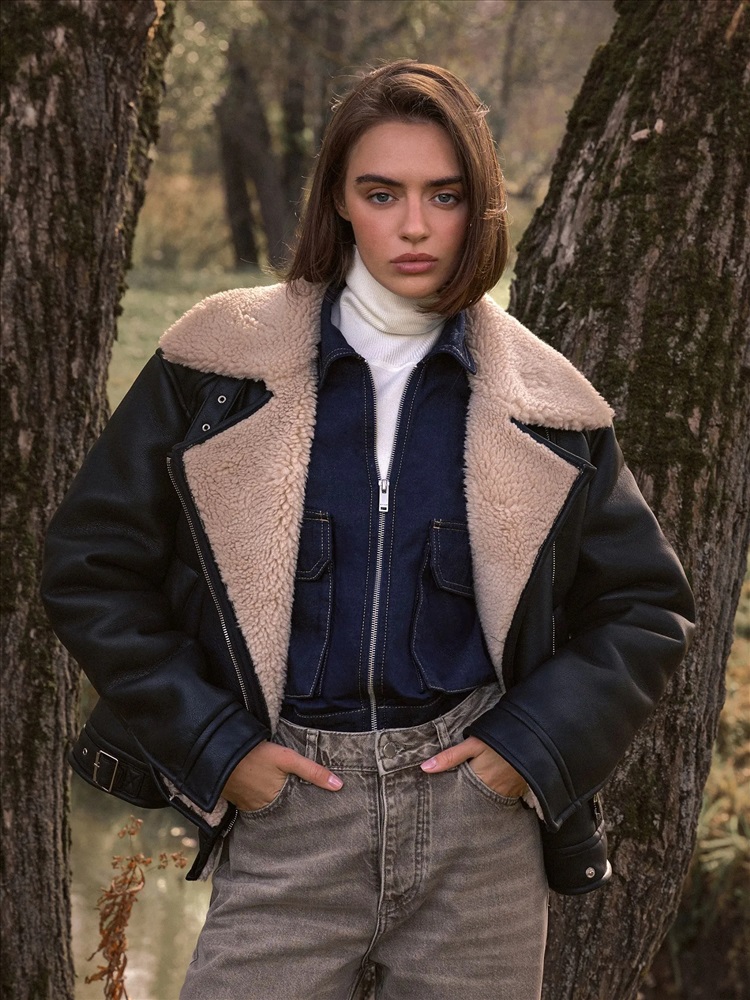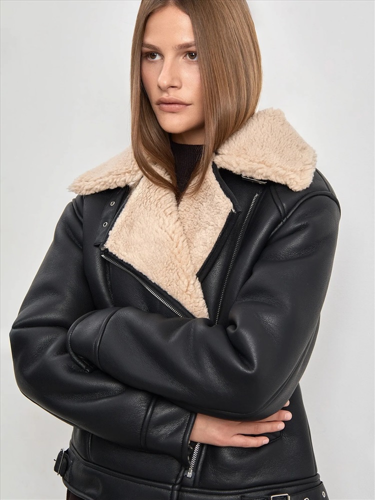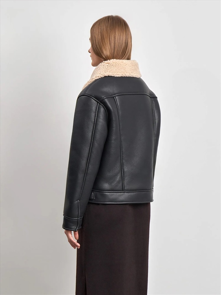 Укороченная дублёнка-косуха чёрного цвета выполнена из качественной экокожи и подбита экомехом. Модель дополнена карманами с широкой листочкой, декоративной молнией и патами. Рассчитана на температуры до 0°C. Изготовлена без подкладки.