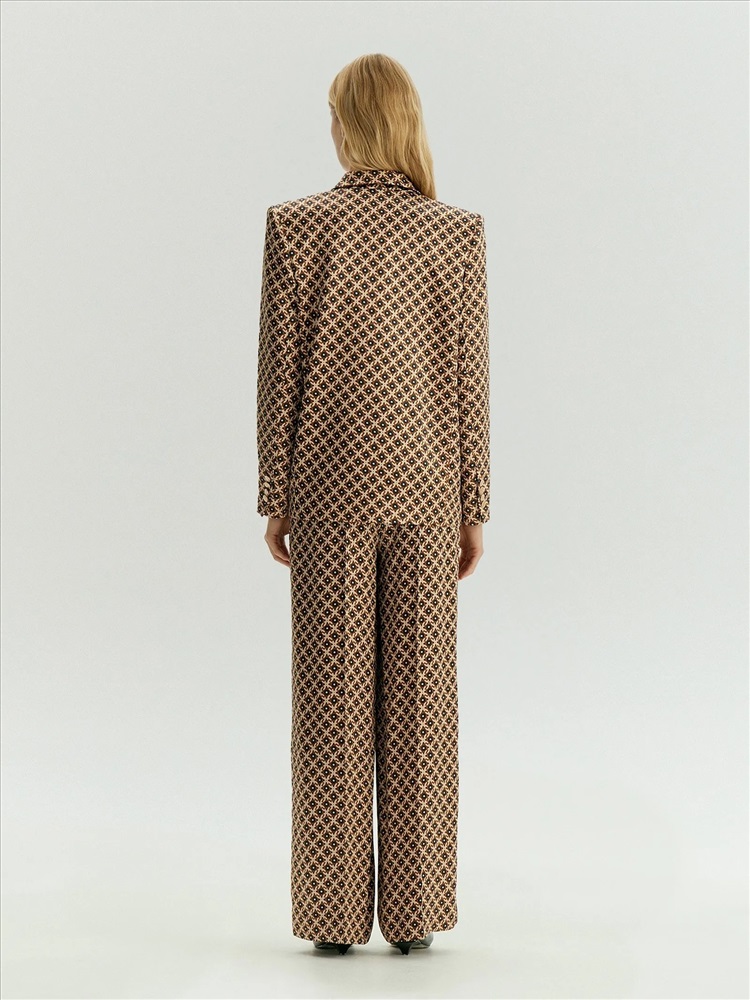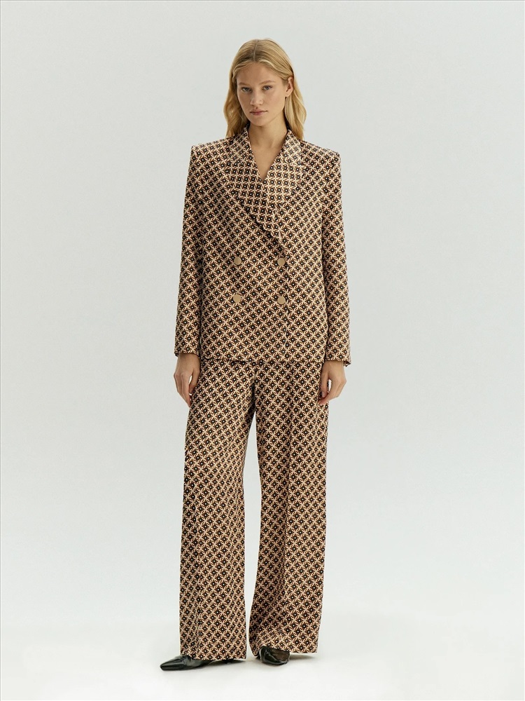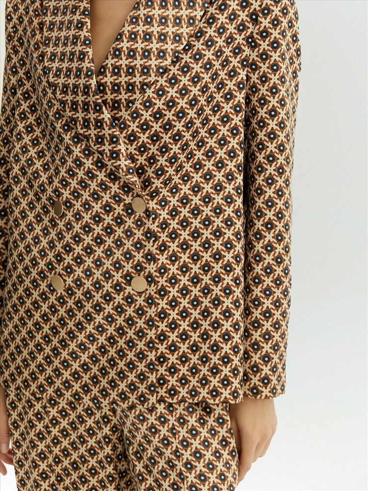 Жакет с принтом "калейдоскоп" и красивым сочетанием золотисто-бежевого с кофейным отлично подойдёт для образов к особому случаю или планов на выходные. Удлинённая модель с широкими лацканами и крупными пуговицами смотрится в меру нарядно. Гладкая вискоза приятно холодит в жару и очень приятно ощущается. Жакет выполнен на подкладке с вискозой. Завершить эффектный образ можно брюками из комплекта или базовым денимом.