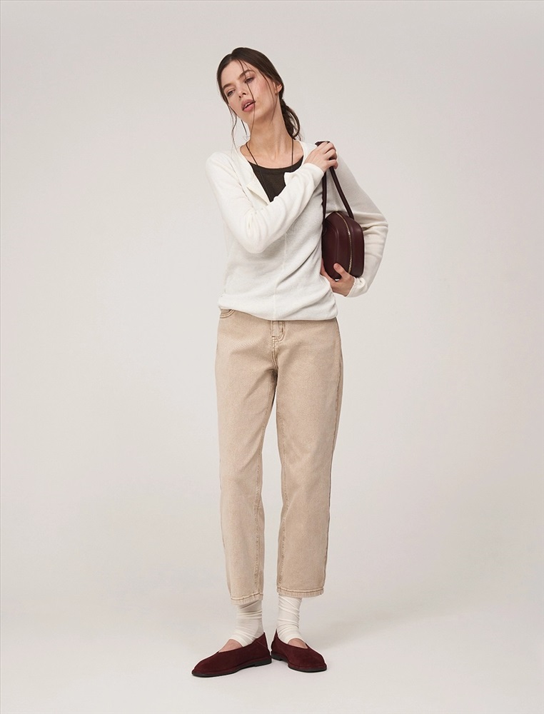 Видео: https-//hassfashion.ru/upload/iblock/4ae/lkv2z95ecoadaadnn03etnglpg6is5tn.mp4 осень-зима 50% Хлопок, 35% Акрил, 10% Кашемир, 5% Шелк Двухслойный вязаный джемпер регулярного силуэта, с длинными рукавами. По бокам — сборки. Круглая горловина растегивается с помощью потайной молнии, приоткрывая контрастный нижний слой. Выполненный из хлопка и акрила с добавлением кашемира и шелка — легкий, но в то же время тонкий и очень мягкий. Представлен в бело-коричневом и серо-желтом оттенках.