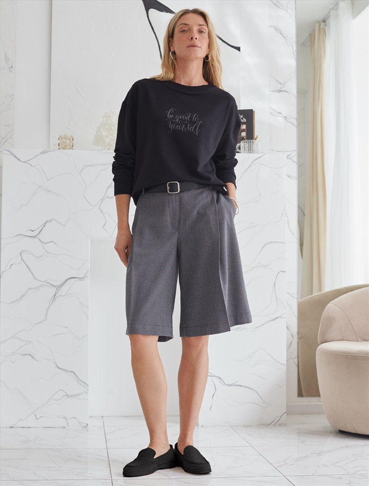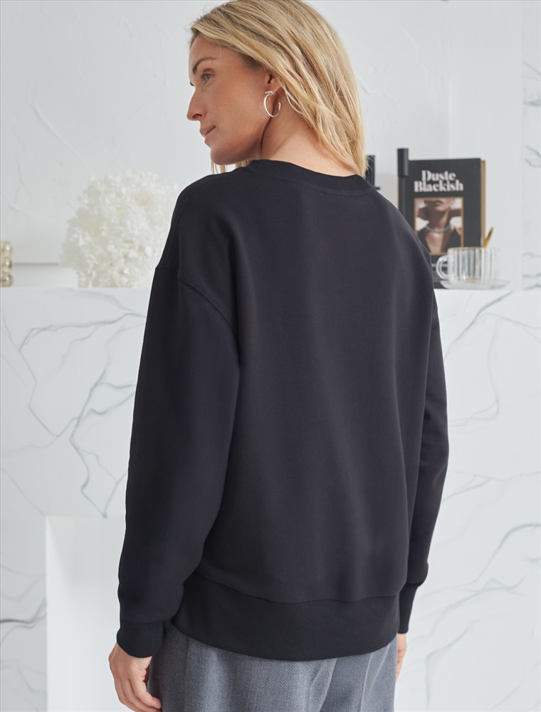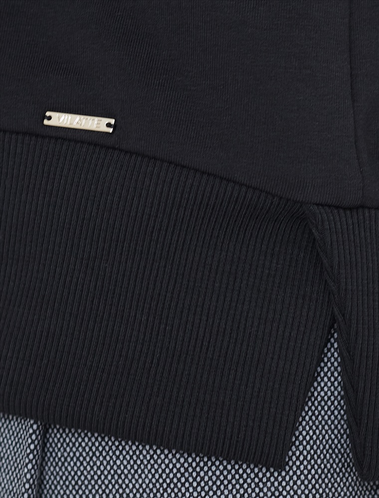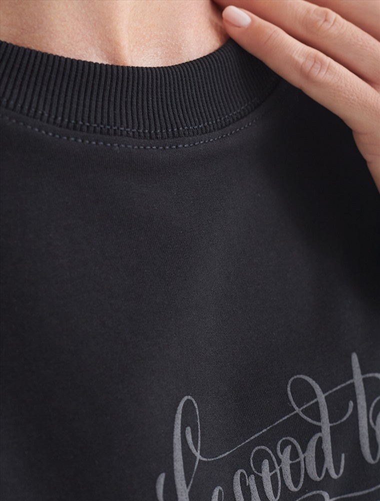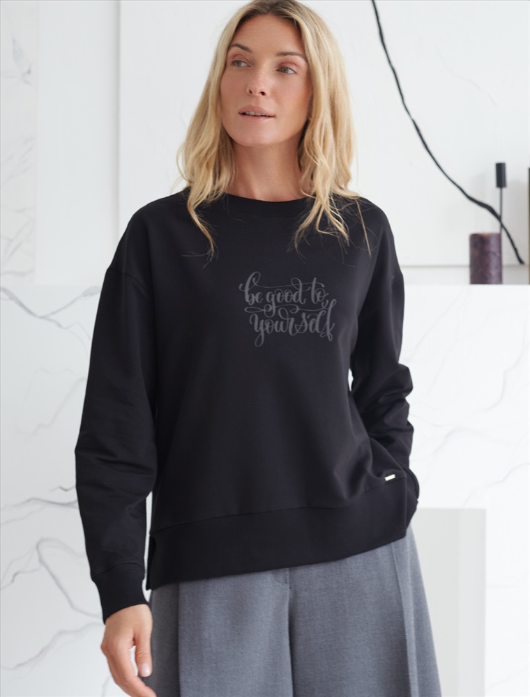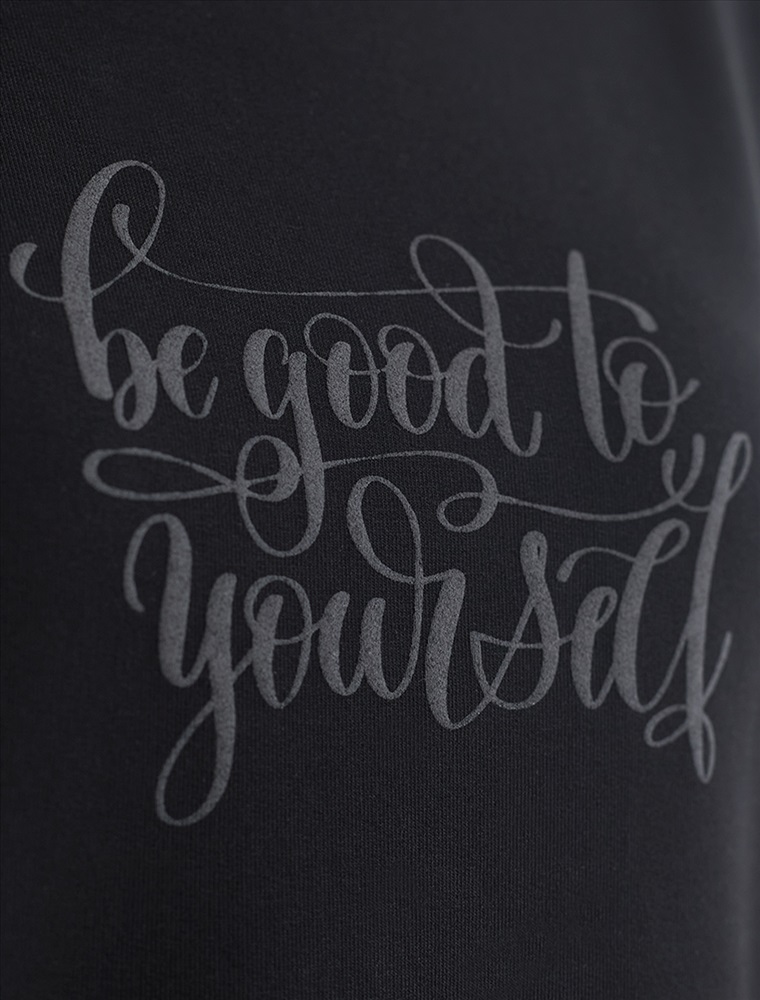 Стильный свитшот черного цвета из премиального футера двухнитки с эластаном сочетает в себе комфорт и оригинальность. Джемпер выполнен из натурального хлопка, который обеспечивает мягкость и дышащие свойства ткани. Нежный материал дарит ощущение уюта в любое время года, а премиальное качество изготовления гарантирует долговечность и сохранение формы после множества стирок. Особенность изделия — спущенная линия плеча и аккуратные разрезы, которые добавляют современный акцент и делают образ более выразительным. Принт в виде надписи придает индивидуальность, позволяя выделиться без лишней вычурности. Перевод надписи Be good Be yourself - Будь хорошей, будь собой. Дополнен металлическим логотипом бренда.