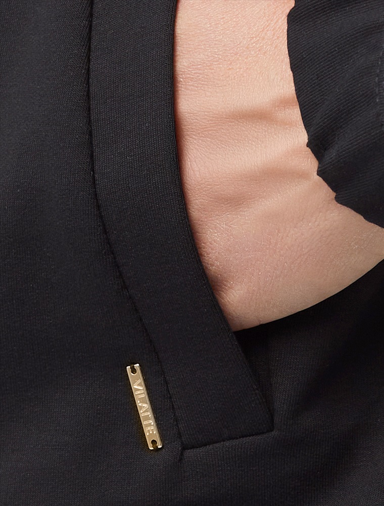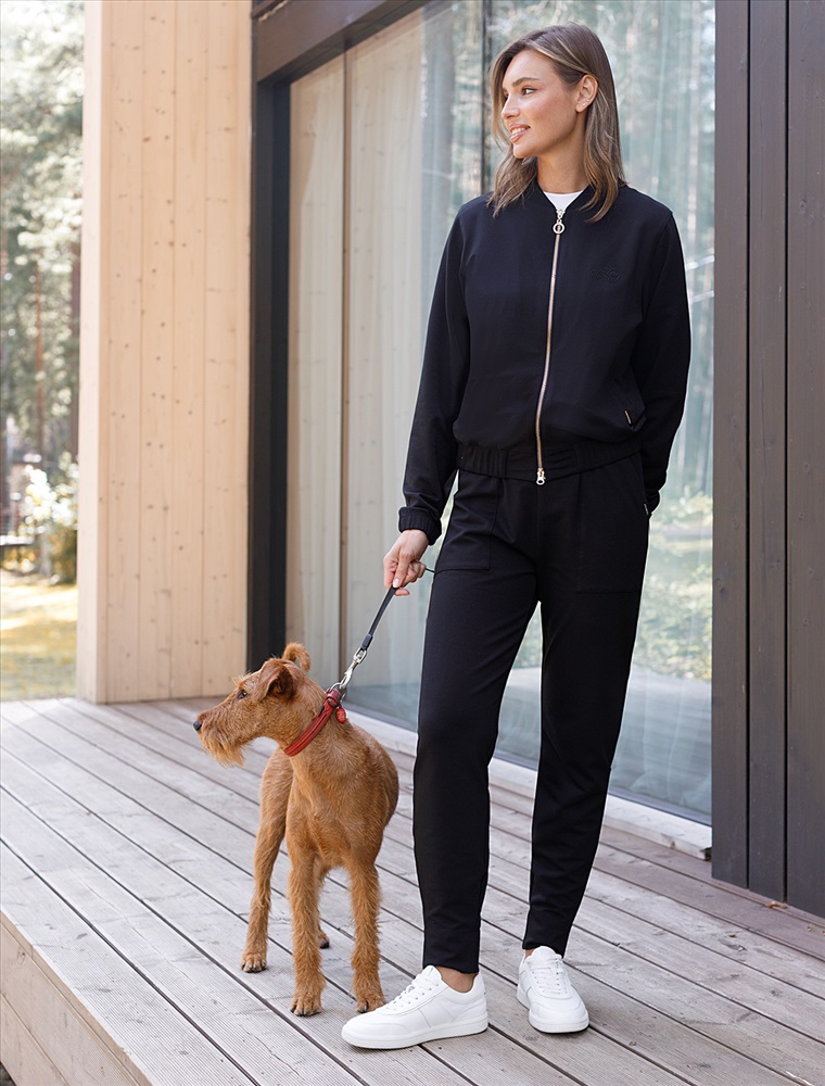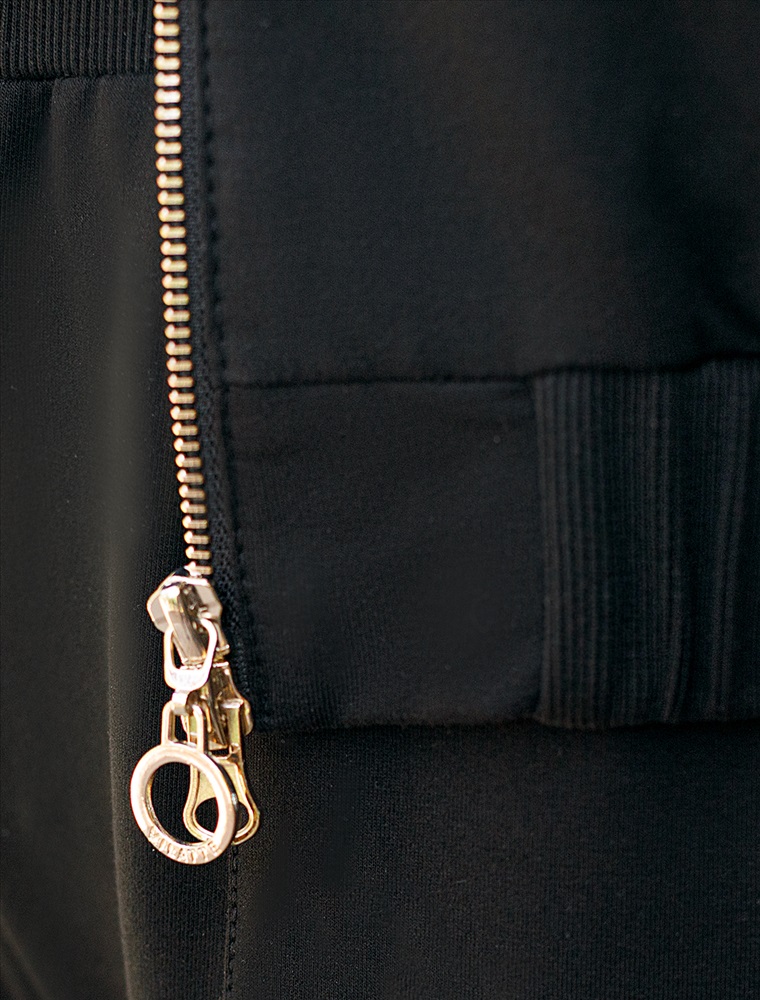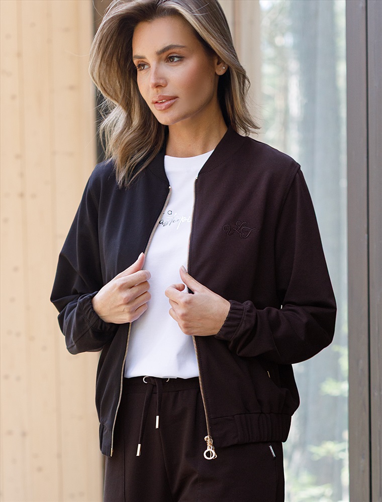Бомбер черного цвета среднего объема на молнии с карманами из премиального футера двухнитки — это стильный выбор для ценительниц минимализма и комфорта. Натуральный состав обеспечивает дышащий эффект, мягкость и приятные тактильные ощущения, Эластичный материал позволяет свободно двигаться без лишнего стеснения, а также отлично сохраняет форму даже после длительного ношения. Манжеты на рукавах и резинка по низу обеспечивают надежную посадку, сохраняя тепло в прохладную погоду. Повседневный бомбер отличается аккуратным силуэтом без лишнего объема и универсальной длиной, которая идеально подходит для повседневного и спортивного образа. Прорезные карманы по бокам добавляют функциональности, сохраняя при этом стильный внешний вид. Бомбер из футера украшен деликатной вышивкой в виде эмблемы бренда, которая придает особый шарм и подчеркивает индивидуальность владелицы. Такой изысканный элемент декора гармонично сочетается с лаконичным дизайном, отвечая современным тенденциям моды. Так же на одном из карманов расположен небольшой металлический логотип бренда.