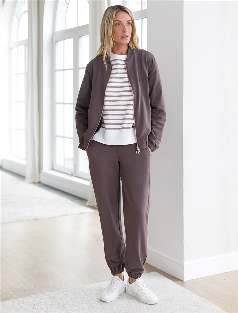 Бомбер кофейного цвета среднего объема на молнии с карманами из премиального футера двухнитки — это стильный выбор для ценительниц минимализма и комфорта. Натуральный состав обеспечивает дышащий эффект, мягкость и приятные тактильные ощущения, Эластичный материал позволяет свободно двигаться без лишнего стеснения, а также отлично сохраняет форму даже после длительного ношения. Манжеты на рукавах и резинка по низу обеспечивают надежную посадку, сохраняя тепло в прохладную погоду. Повседневный бомбер отличается аккуратным силуэтом без лишнего объема и универсальной длиной, которая идеально подходит для повседневного и спортивного образа. Прорезные карманы по бокам добавляют функциональности, сохраняя при этом стильный внешний вид. Бомбер из футера украшен деликатной вышивкой в виде эмблемы бренда, которая придает особый шарм и подчеркивает индивидуальность владелицы. Такой изысканный элемент декора гармонично сочетается с лаконичным дизайном, отвечая современным тенденциям моды. Так же на одном из карманов расположен небольшой металлический логотип бренда.