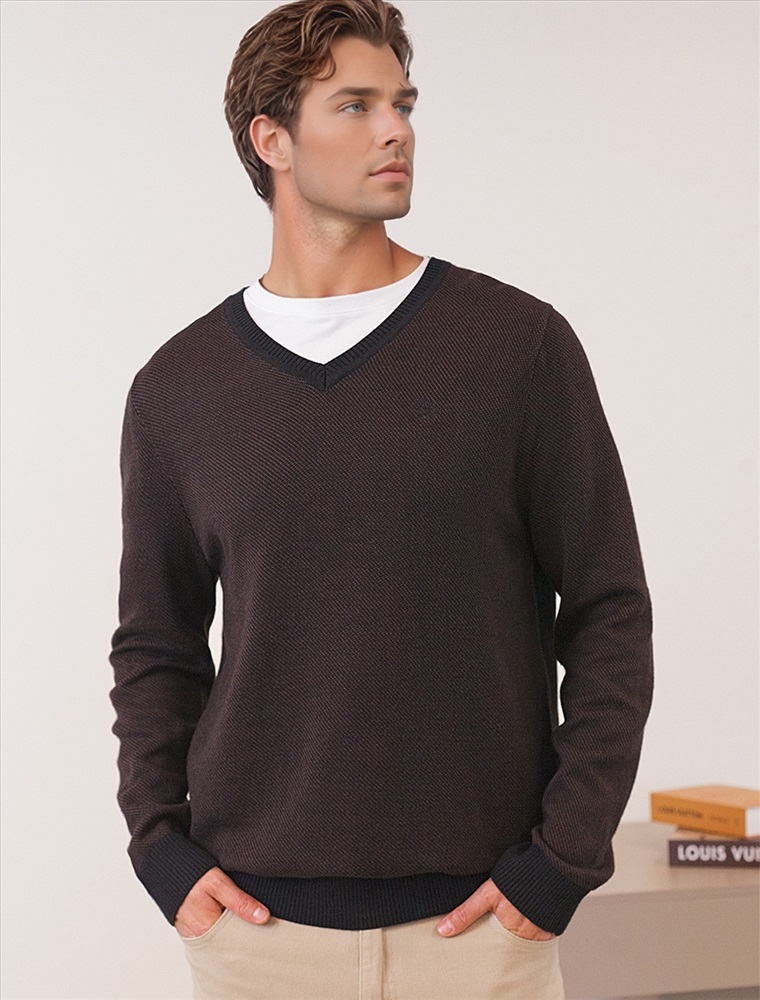 Для изготовления черно-коричневого джемпера с клиновидным вырезом и длинными рукавами использовали пряжу из премиального хлопка с акрилом. У модели получилась очень мягкая и приятная на ощупь фактура из переплетения нитей нескольких цветов. Изделие комфортно носить даже на голое тело или дополнив образ футболкой. Роскоши вносит вышитый логотип бренда.