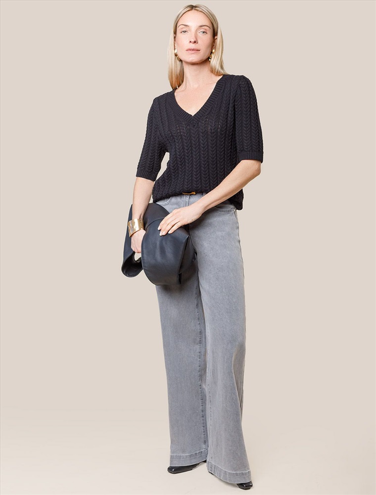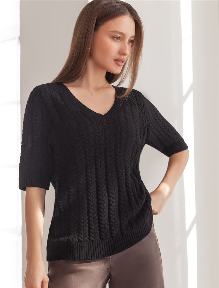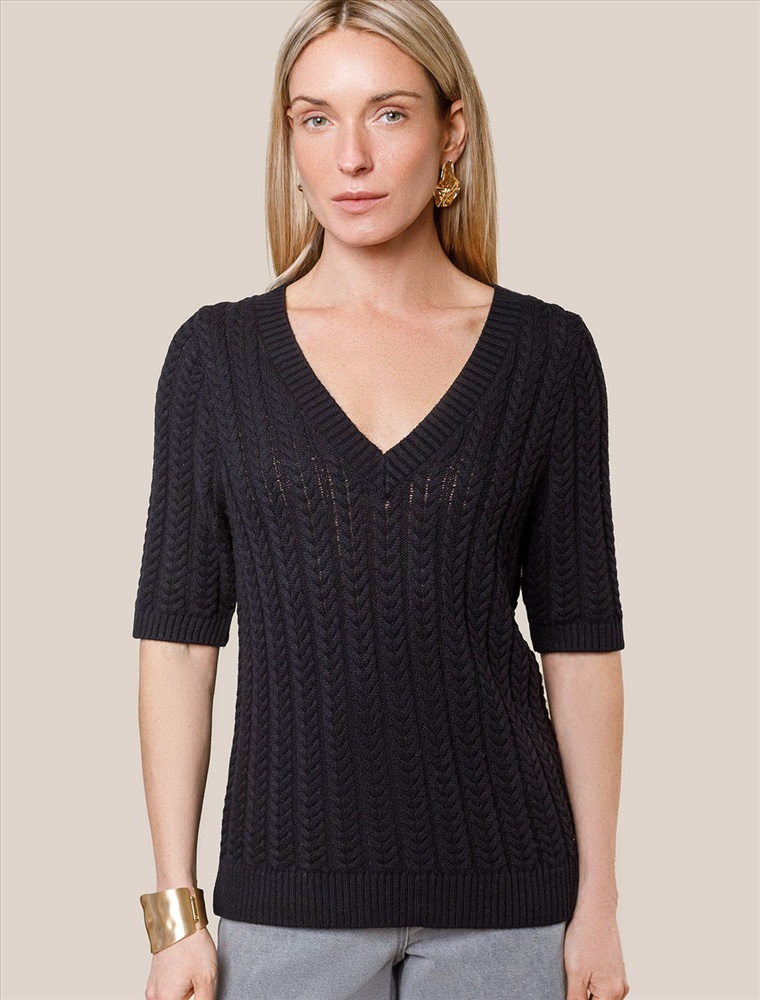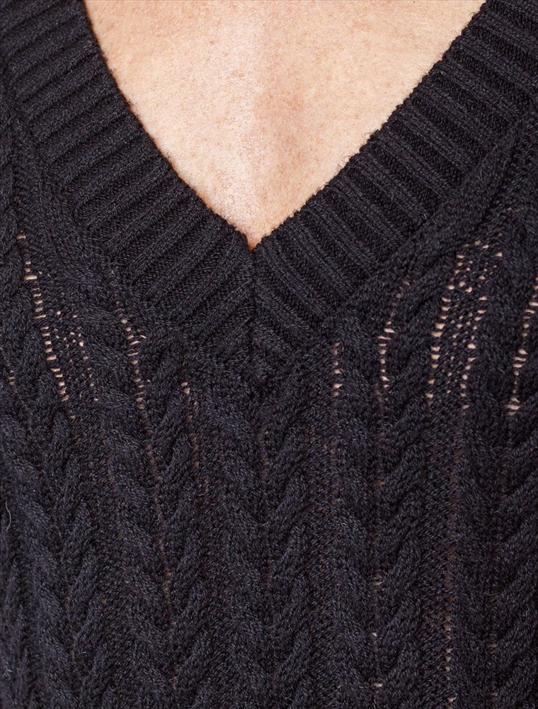 Размер товара на первом фото: 42 Джемпер фактурной вязки выполнен из хлопка с добавлением кашемира. Модель с V-вырезом с вывязанным орнаментом цепи. Мягкая и очень приятная пряжа совершенно не колется, сохраняет тепло при этом не перегревая, гарантируя безупречный комфорт.