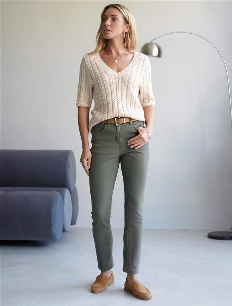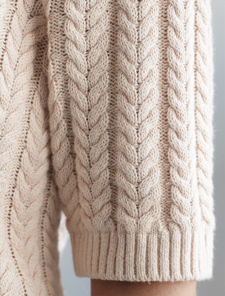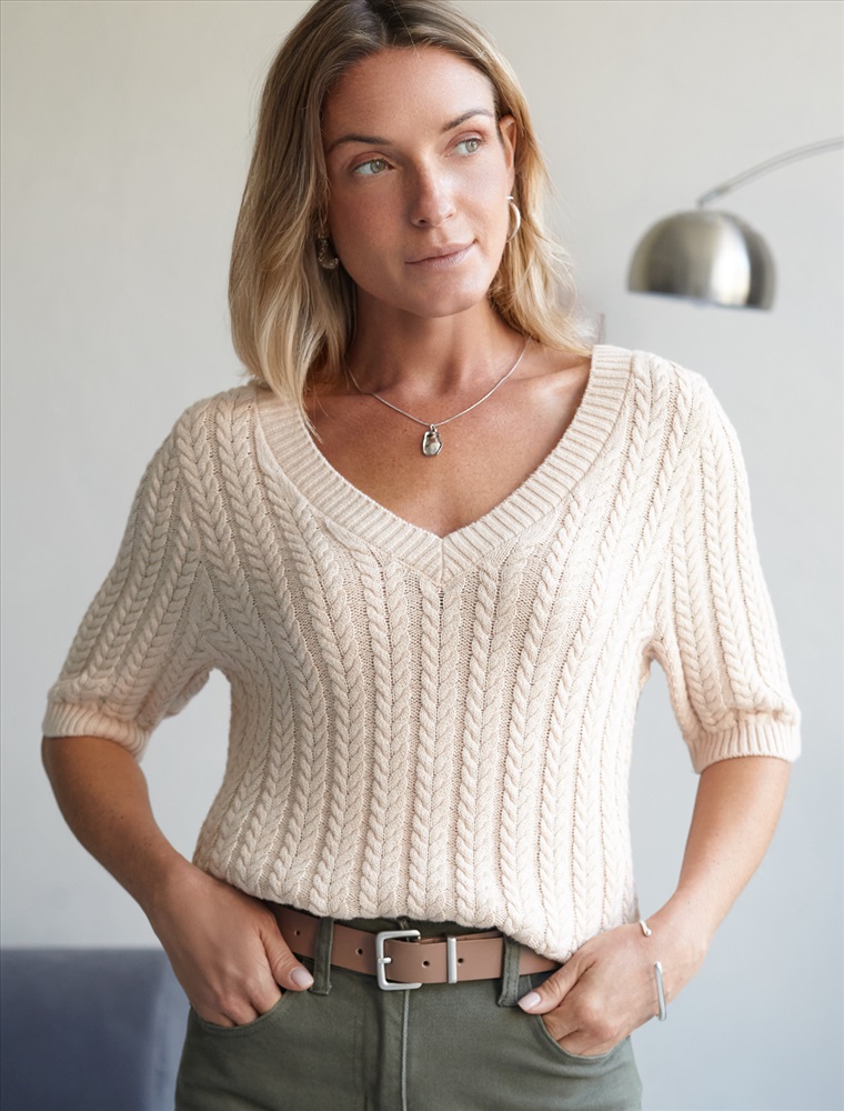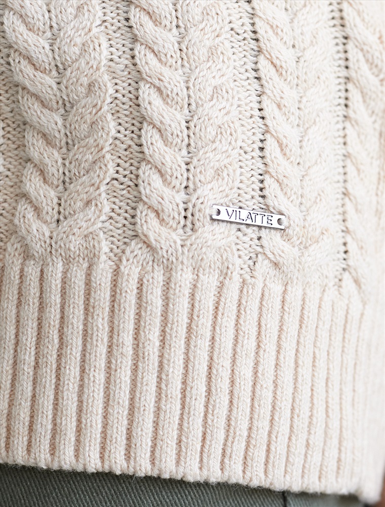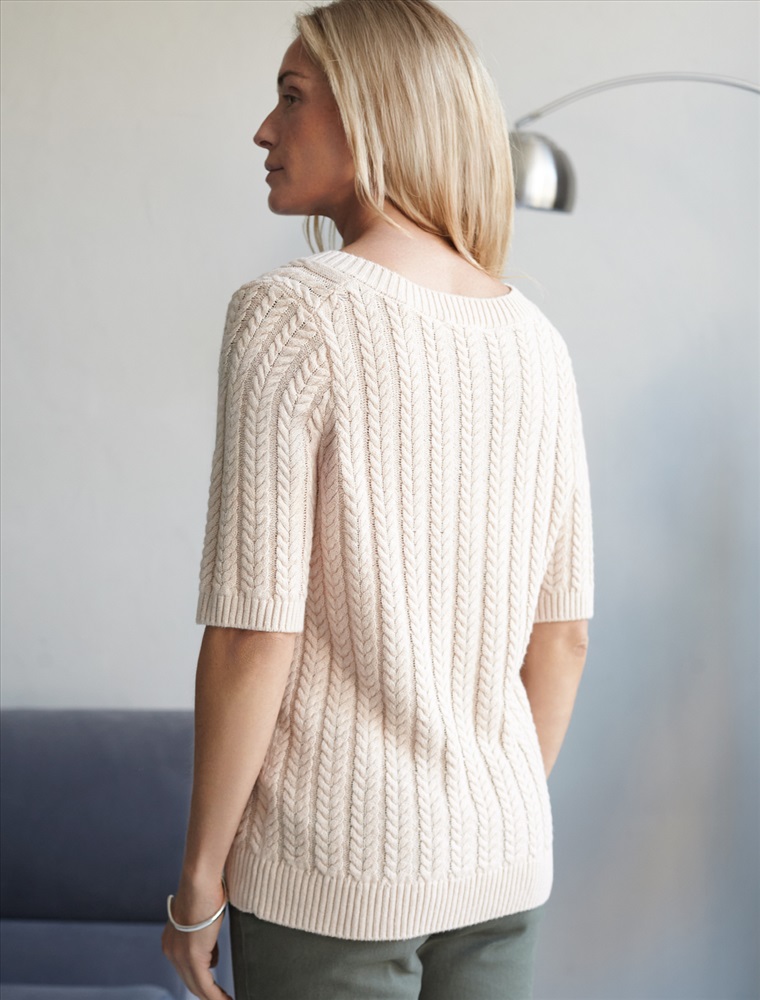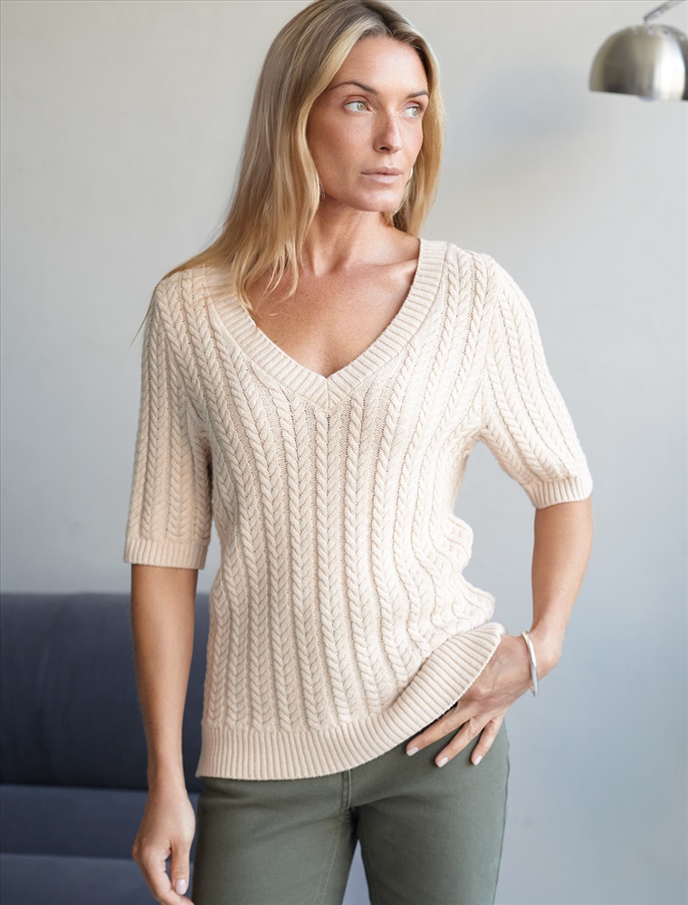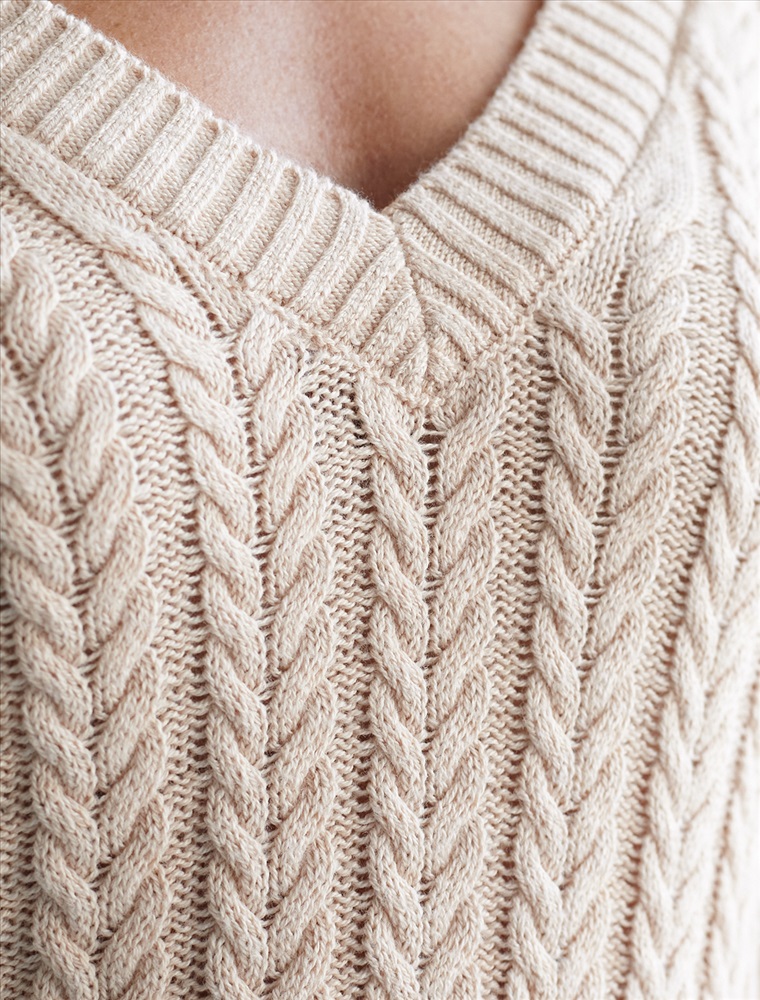 Размер товара на первом фото: 42 Джемпер фактурной вязки выполнен из хлопка с добавлением кашемира. Модель с V-вырезом с вывязанным орнаментом цепи. Мягкая и очень приятная пряжа совершенно не колется, сохраняет тепло при этом не перегревая, гарантируя безупречный комфорт.