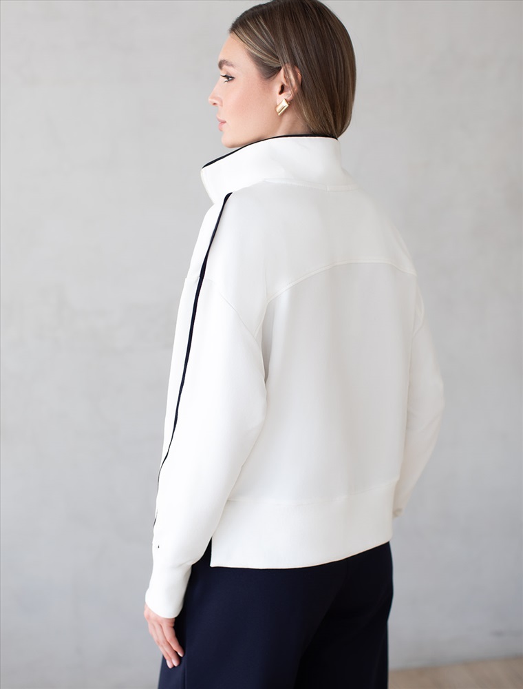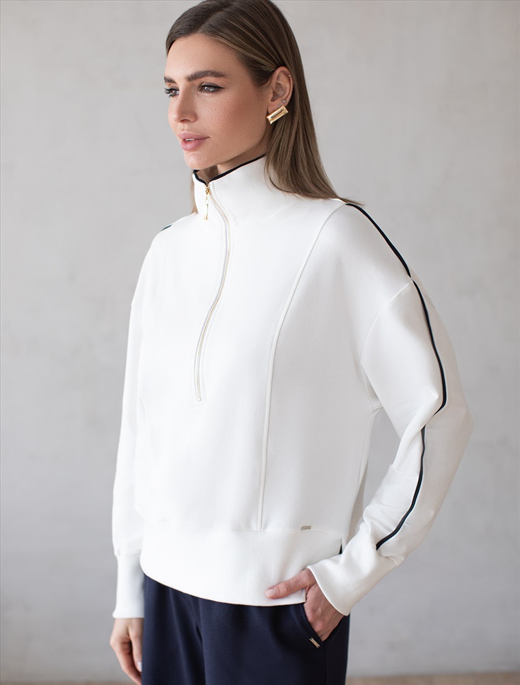 Джемпер с воротом на молнии выполнен из эластичного футера двухнитки. Модель умеренно свободного кроя. По рукавам и воротнику кант из футера контрасного цвета. Изделие дополнено золотистым логотипом бренда. Сочетается в костюме с брюками D44.141, D44.142, шортами D48.009 и юбкой-шортами D46.041. Правила ухода: использовать жидкое моющее средство (гель для стирки), добавлять к нему кислородный пятновыводитель для цветных вещей, и салфетки (защита от окрашивания). Стирка при 30 градусах, отжим на максимальных оборотах.