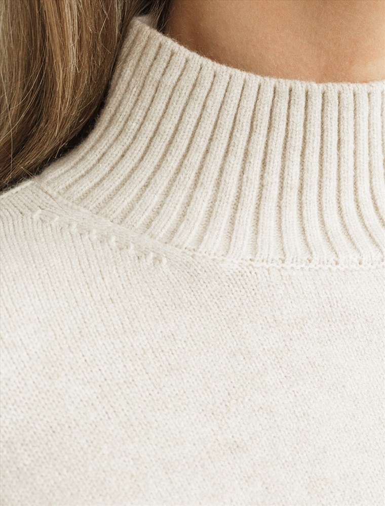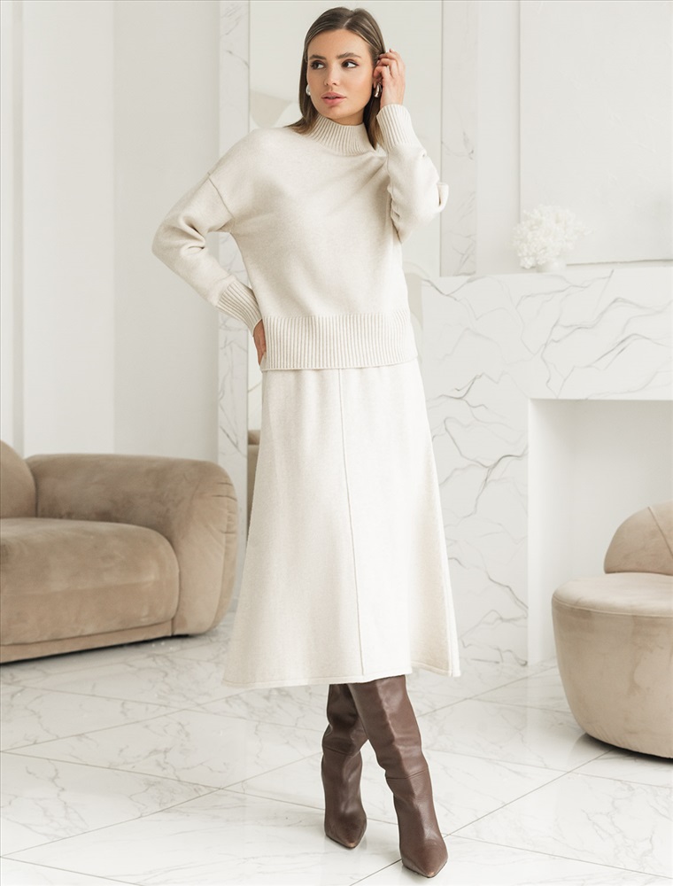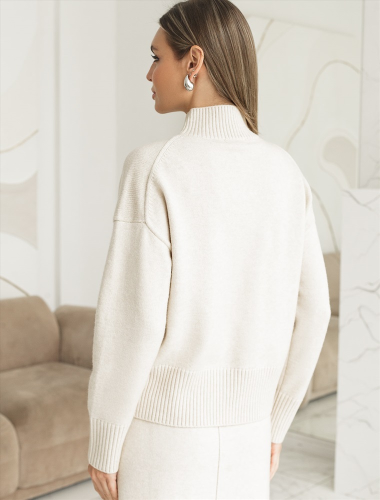 Размер товара на первом фото: 42 Свитер натурального овсяного цвета с высоким воротом связан из высококачественной пряжи с кашемиром — идеальное сочетание мягкости и практичности. Пряжа с кашемиром придаёт ему бархатистую нежность и тонкую структуру, каждое прикосновение с которой, напоминает о тепле и уюте в прохладные дни. Благодаря нежной текстуре материала этот вариант отлично подходит даже для чувствительной кожи, не вызывая раздражения и дискомфорта в течение дня. Спущенная иния плеча придает свитеру расслабленный вид, подчеркивая актуальный стильный образ обладательницы. Универсальный крой и длина подходит для разных типов фигуры, в том числе и на большие размеры, свободный фасон не стесняет движений, а оверсайз силуэт актуален в этом сезоне и выглядит современно. Длинный рукав с широкими манжетами защищает от холода, делая этот вариант особенно практичным в осенне-зимний период. Такой теплый свитер станет надежным спутником в межсезонье и зимние дни, сочетая практичность, комфорт и стиль. Сочетается в костюме с брюками D38.013, D38.012 и юбкой D36.016 Комментарии к товару