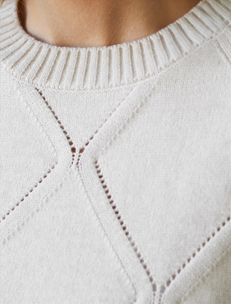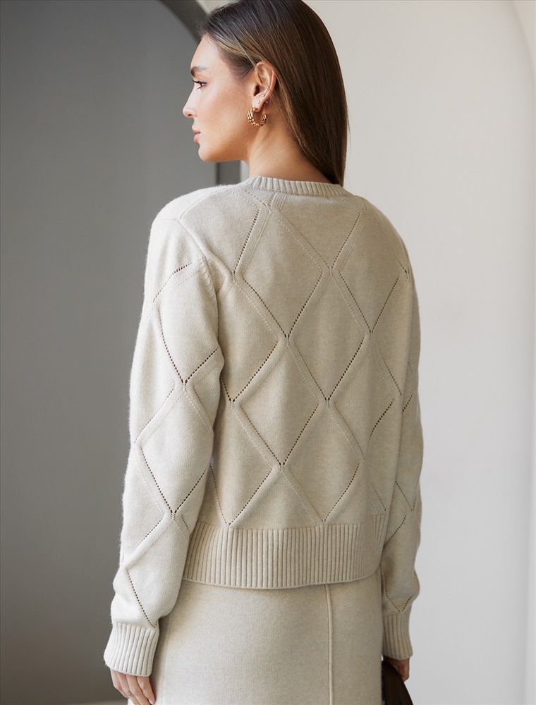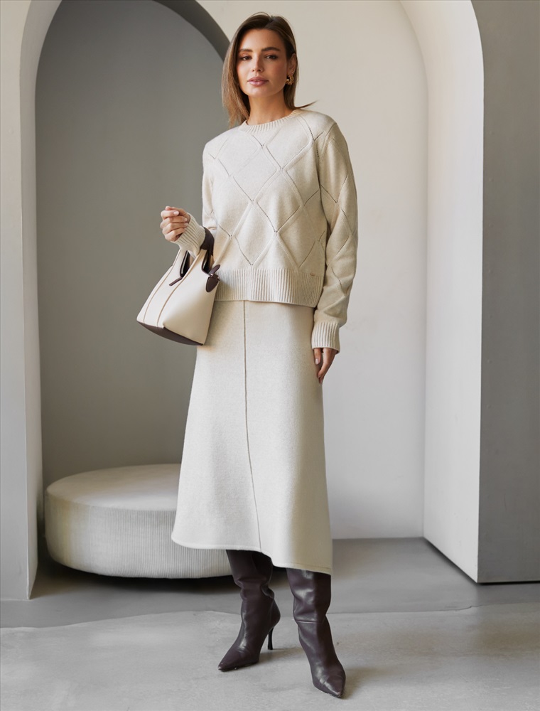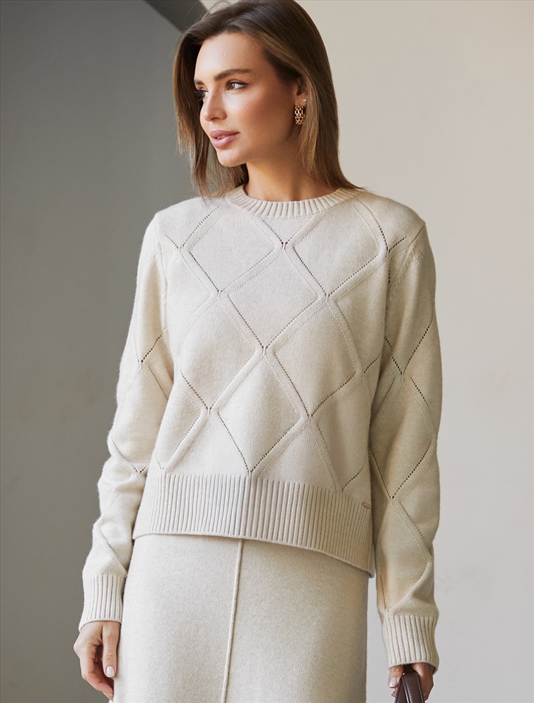 Размер товара на первом фото: 42 Невероятно женственный джемпер натурального овсяного цвета с круглым вырезом связан из высококачественной пряжи с кашемиром — идеальное сочетание мягкости и практичности. Пряжа с кашемиром придаёт ему бархатистую нежность и тонкую структуру, каждое прикосновение с которой, напоминает о тепле и уюте в прохладные дни. Благодаря нежной текстуре материала этот вариант отлично подходит даже для чувствительной кожи, не вызывая раздражения и дискомфорта в течение дня. Сдержанный, элегантный силуэт джемпера подчёркивает вкуc обладательницы, а филигранная отделка ворота — внимание к деталям. Фактурный графичный узор украшает джемпер, добавляя легкую нотку нарядности без лишней вычурности. Универсальный оттенок и изящная мягкость делают его идеальным выбором в любой ситуации. Широкие манжеты и нижний край добавляют аккуратности, а продуманная посадка делает повседневный джемпер удобным для многослойных образов — от офисного комплекта, например, в сочетании с блузкой, до расслабленного уикенда. Свободный крой джемпера идеально подходит для женщин, которые ценят удобство и стиль одновременно, а так же идеально подходит на большие размеры. Благодаря качественной пряже свитер сохраняет форму и внешний вид даже после многократных носок. Практичный фасон идеально подходит для работы в офисе или встреч с друзьями. Благодаря классическому крою джемпер гармонично сочетается практически с любыми элементами гардероба, помогая всегда выглядеть актуально. Сочетается в костюме с брюками D38.013, D38.012 и юбкой D36.016 Комментарии к товару