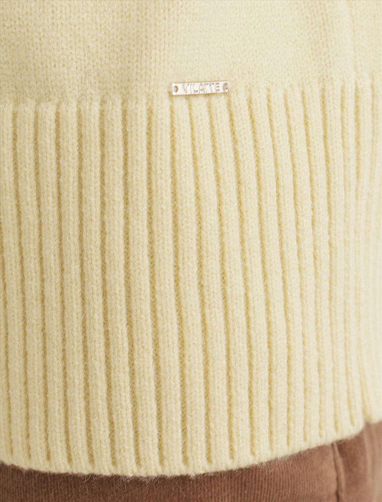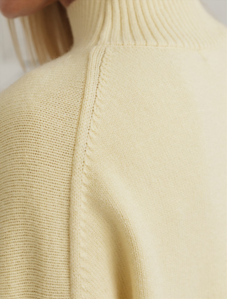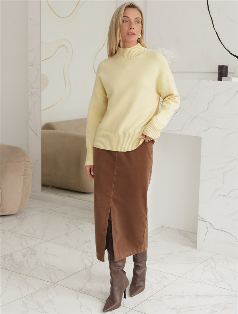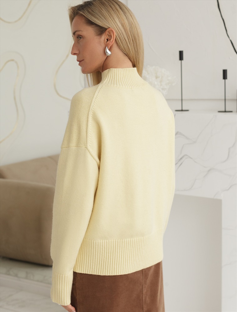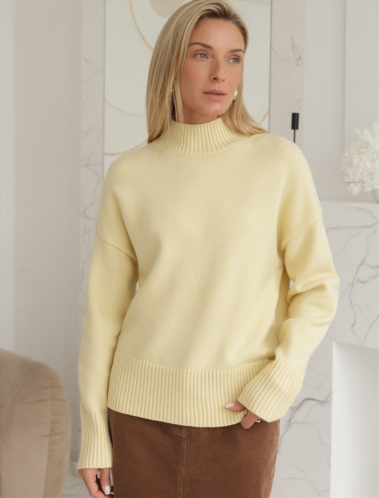 Размер товара на первом фото: 42 Свитер светло-желтого цвета с высоким воротом связан из высококачественной пряжи с кашемиром — идеальное сочетание мягкости и практичности. Пряжа с кашемиром придаёт ему бархатистую нежность и тонкую структуру, каждое прикосновение с которой, напоминает о тепле и уюте в прохладные дни. Благодаря нежной текстуре материала этот вариант отлично подходит даже для чувствительной кожи, не вызывая раздражения и дискомфорта в течение дня. Спущенная линия плеча придает свитеру расслабленный вид, подчеркивая актуальный стильный образ обладательницы. Универсальный крой и длина подходит для разных типов фигуры, в том числе и на большие размеры, свободный фасон не стесняет движений, а оверсайз силуэт актуален в этом сезоне и выглядит современно. Длинный рукав с широкими манжетами защищает от холода, делая этот вариант особенно практичным в осенне-зимний период. Такой теплый свитер станет надежным спутником в межсезонье и зимние дни, сочетая практичность, комфорт и стиль. Сочетается в костюме с брюками D38.013, D38.012 и юбкой D36.016 Комментарии к товару